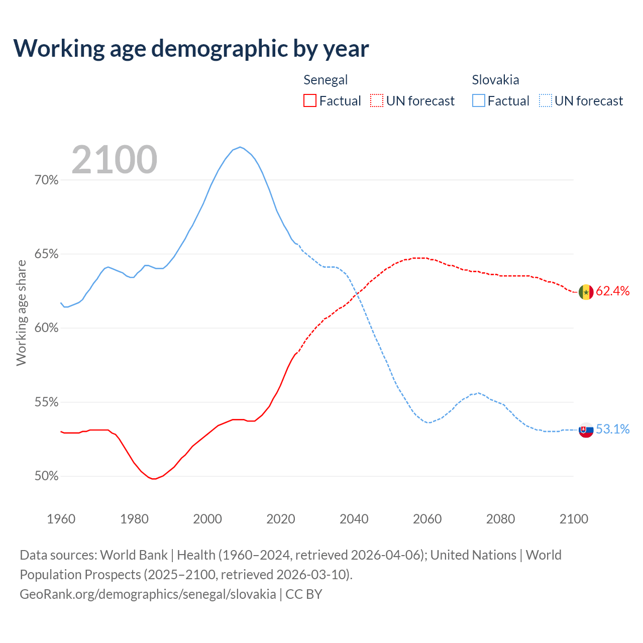 Median age Senegal vs Slovakia, 1960-2100