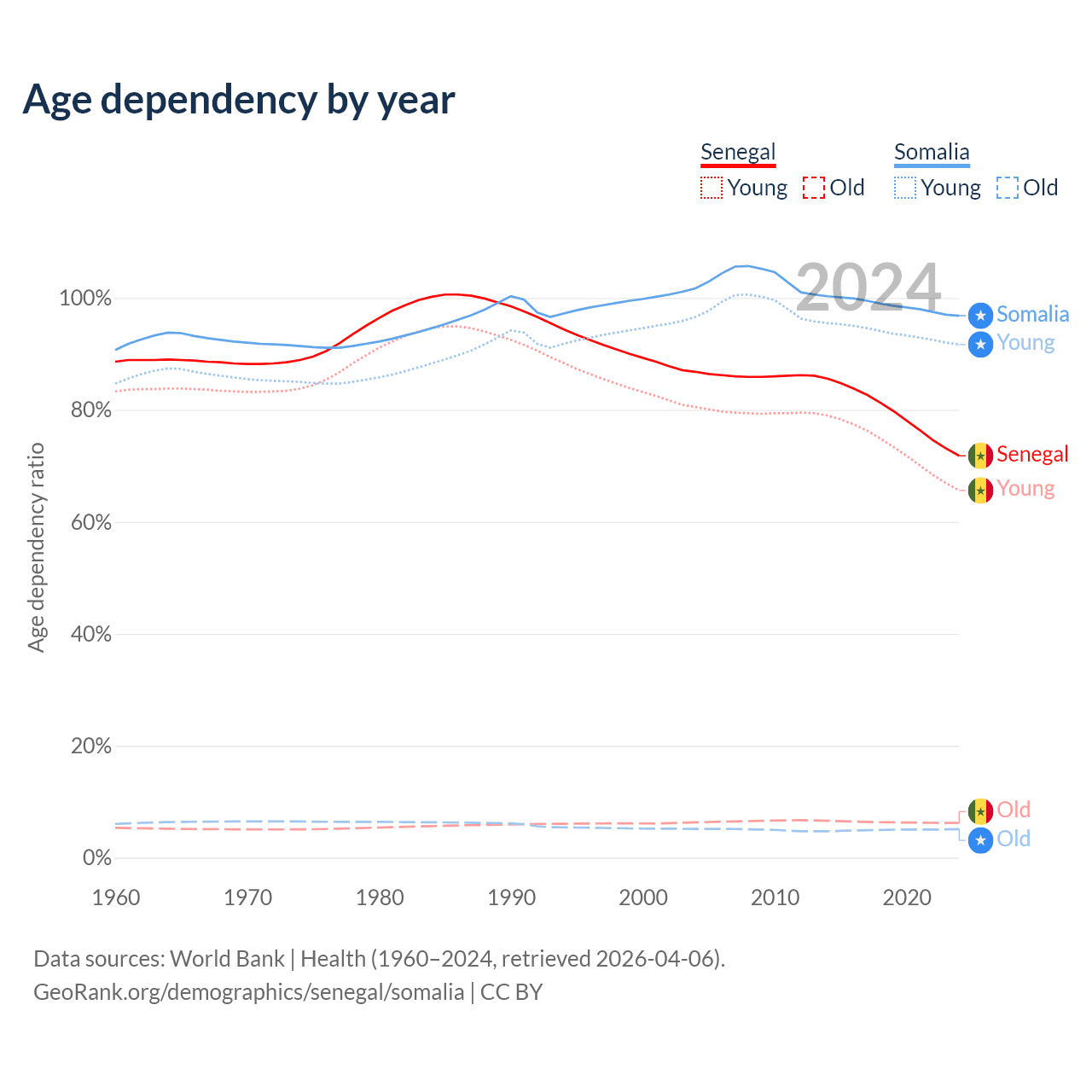 - Senegal is ranked 162/196 by median age (oldest to youngest) vs 194/196 for Somalia.