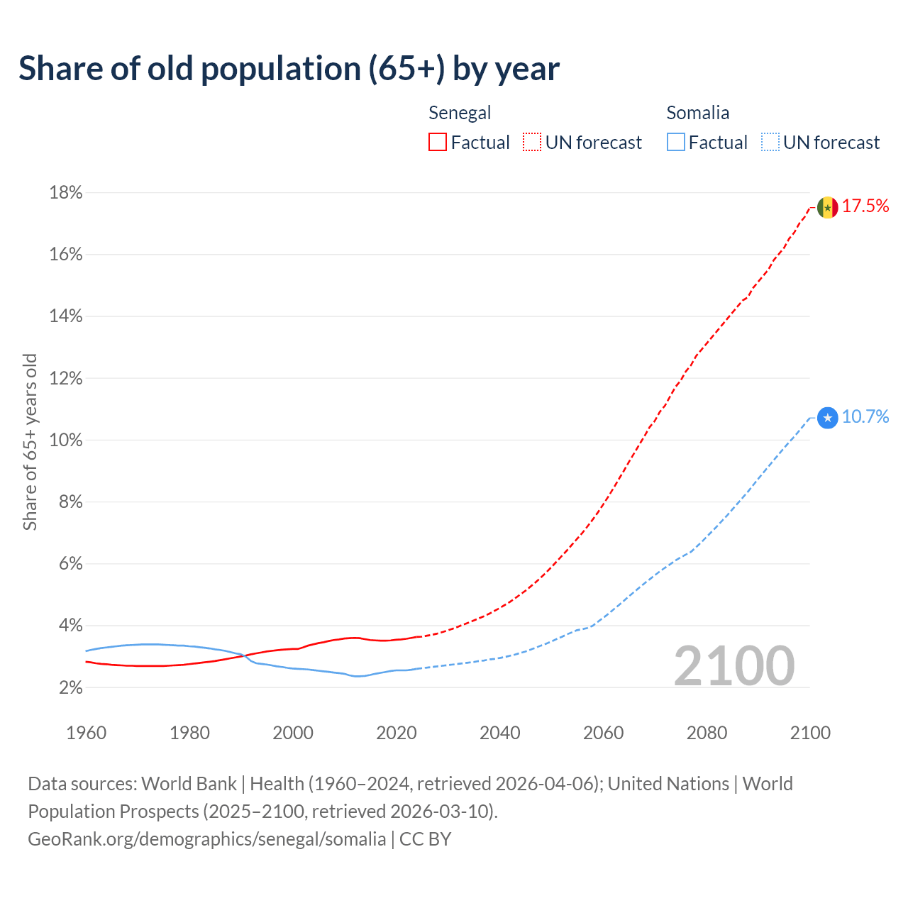 - The share of old-age demographic (65+) in Senegal is 3.62% vs 2.59% in Somalia.