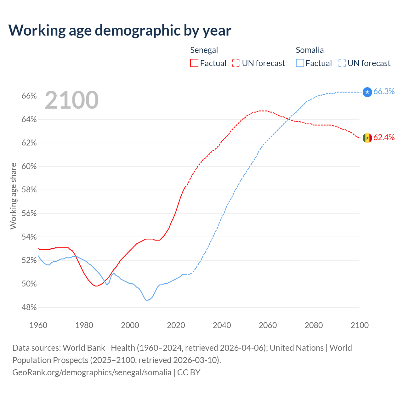 - Senegal has 11.3M working age adults (aged 15-64) vs 10.4M in Somalia.