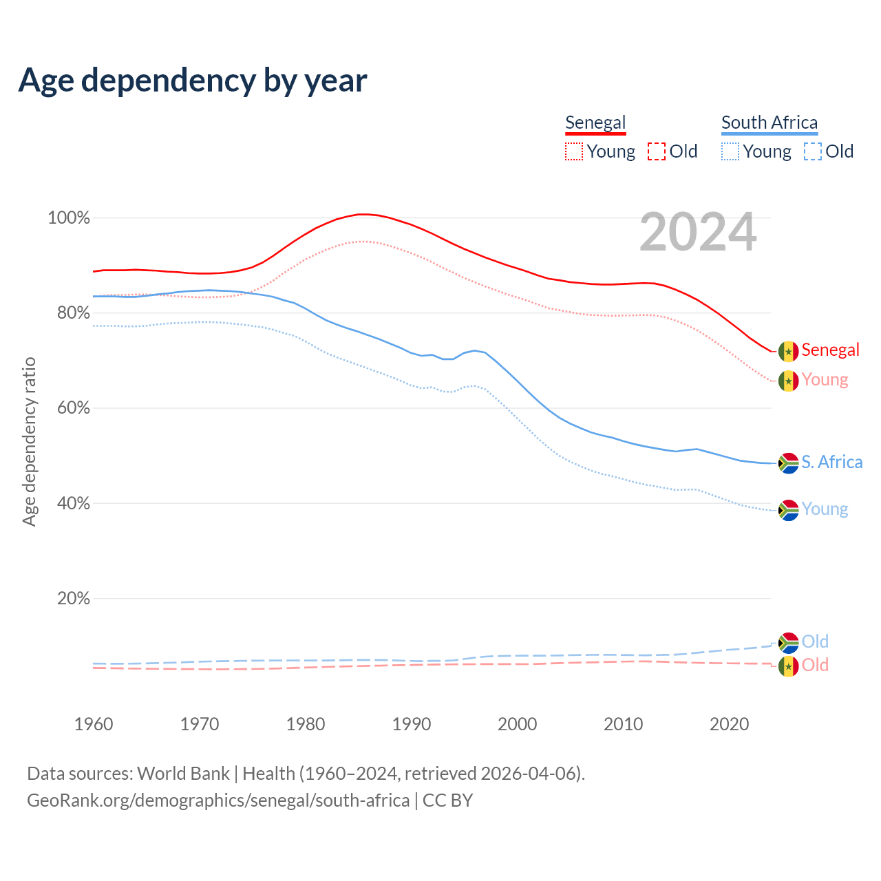 - Senegal is ranked 162/196 by median age (oldest to youngest) vs 107/196 for South Africa.