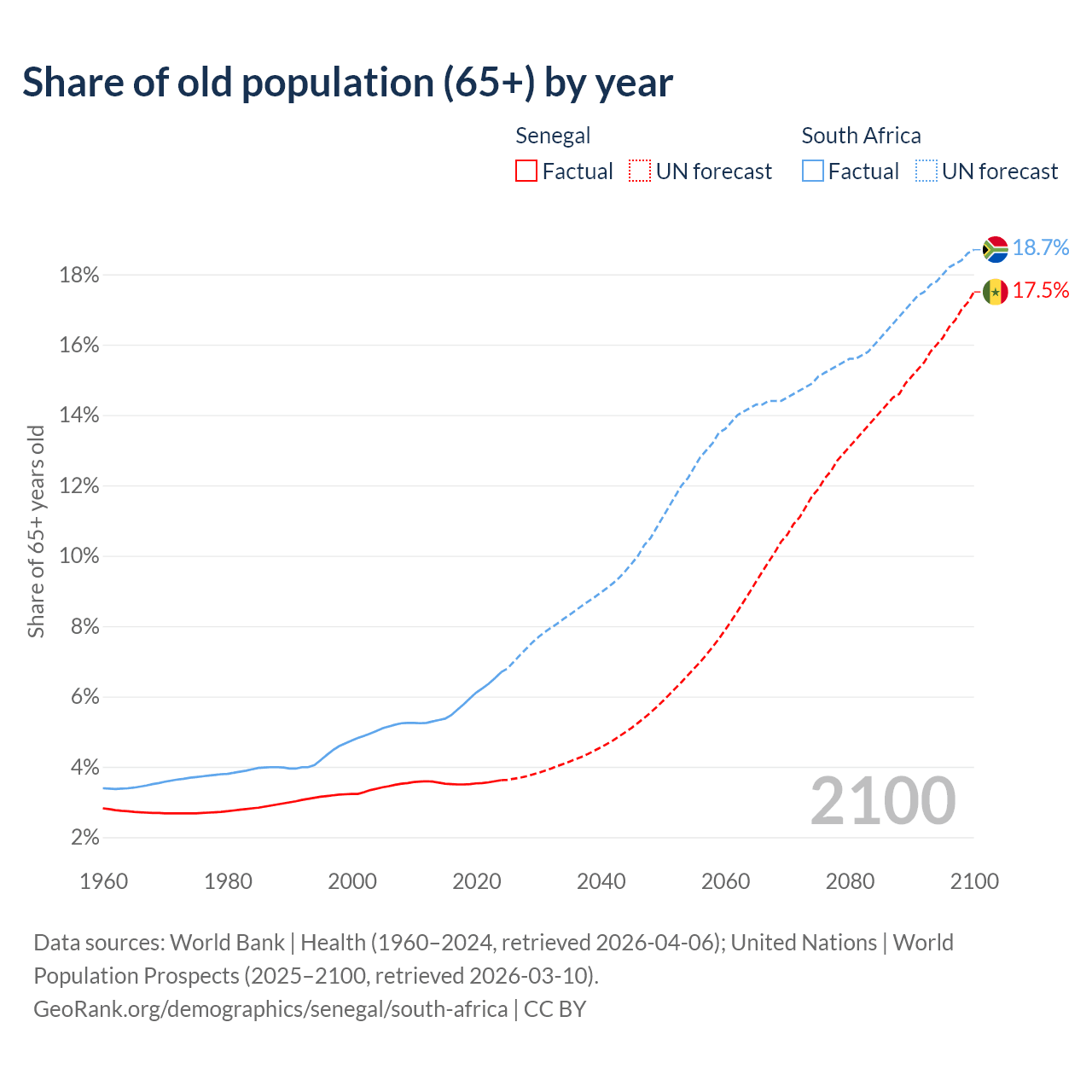 The share of older people aged 65 and over is 3.62% in Senegal and 6.69% in South Africa. Life expectancy in Senegal compared to South Africa .