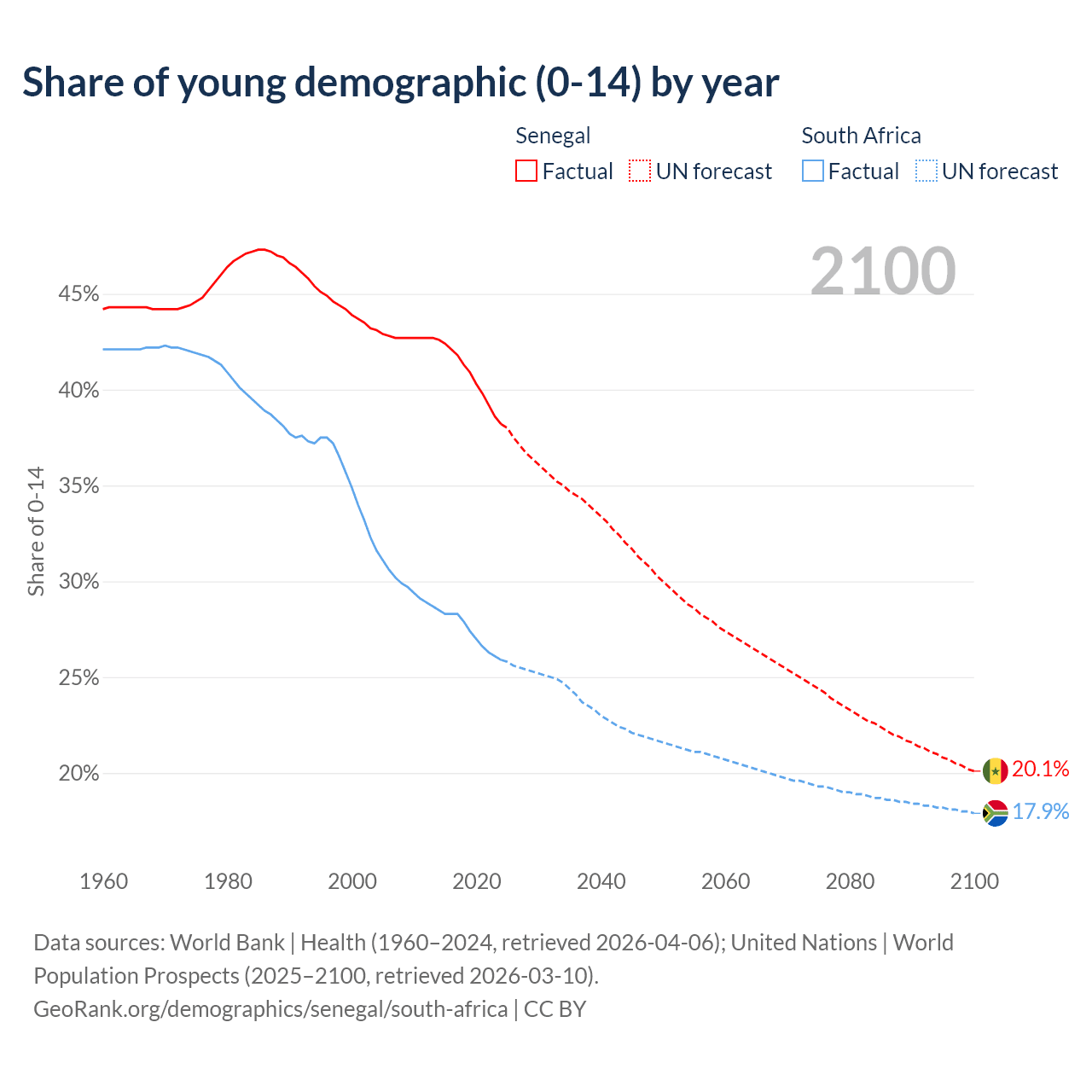 - As of 2026, the population of Senegal is 19.5M vs 65.7M in South Africa - 3.37 times difference.