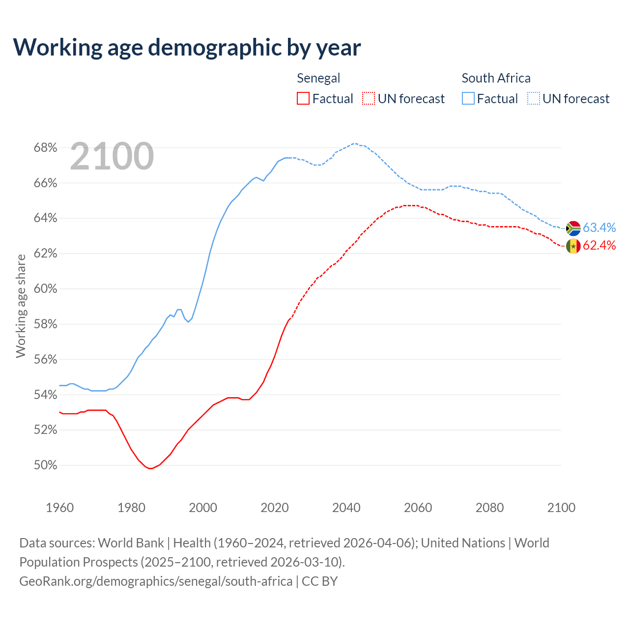- Senegal has 11.3M working age adults (aged 15-64) vs 44.3M in South Africa.
