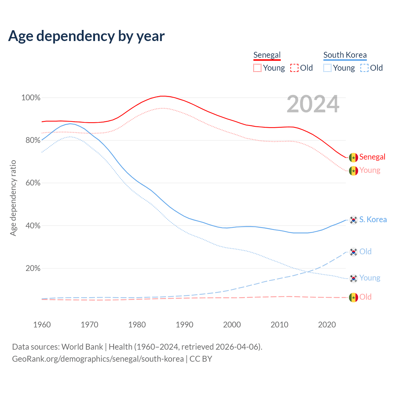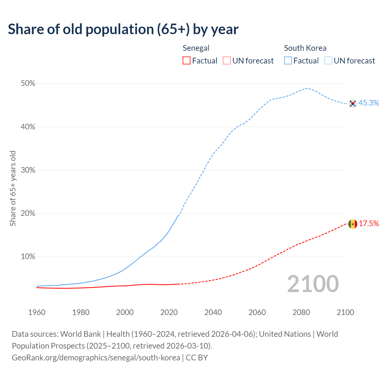The share of older people aged 65 and over is 3.62% in Senegal and 19.3% in South Korea. Life expectancy in Senegal compared to South Korea .