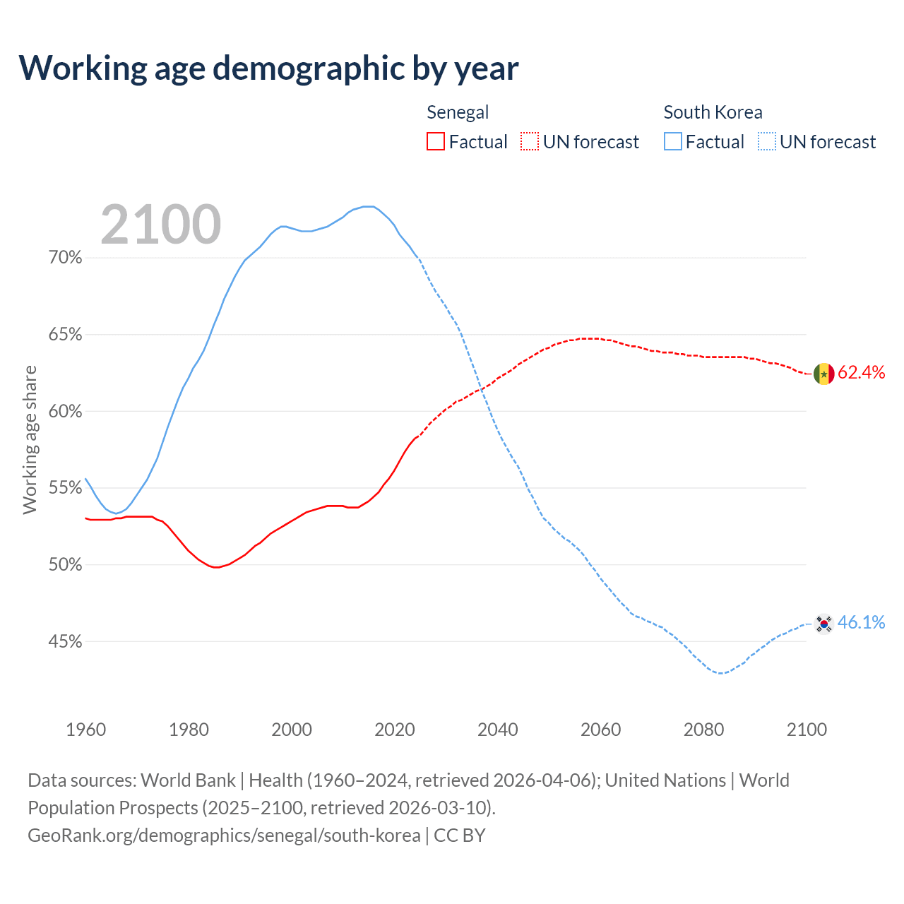 - The share of young demographic (0-15 years old) in Senegal is 38.2% vs 10.6% in South Korea.