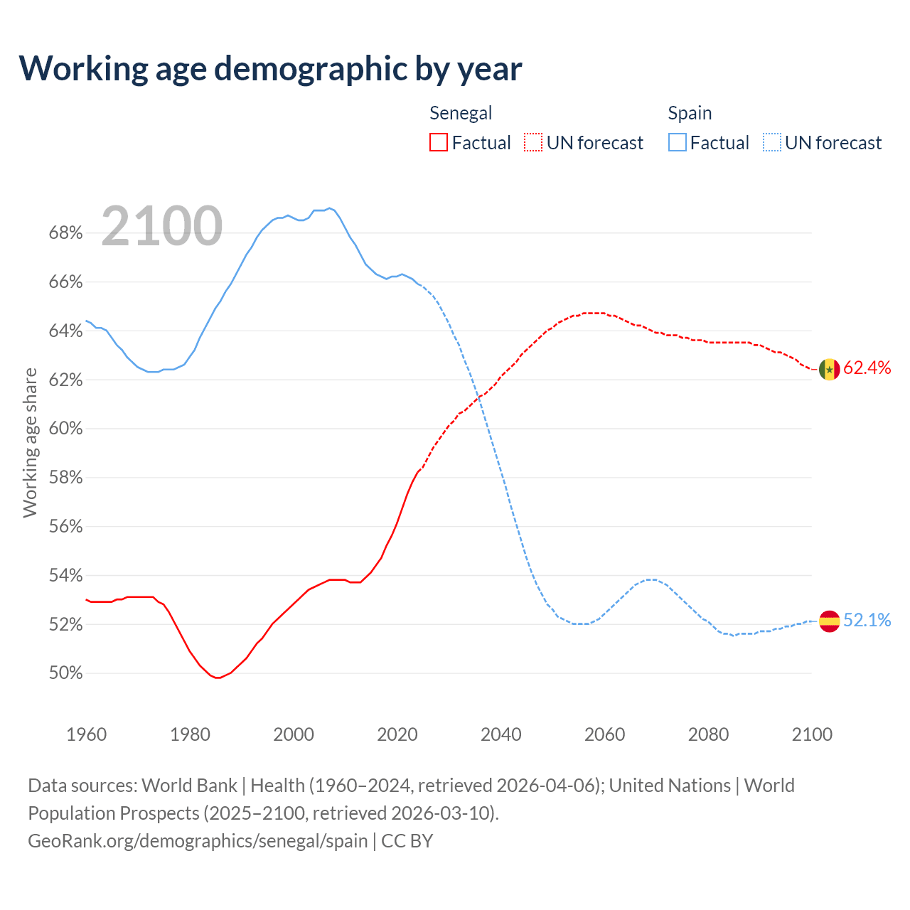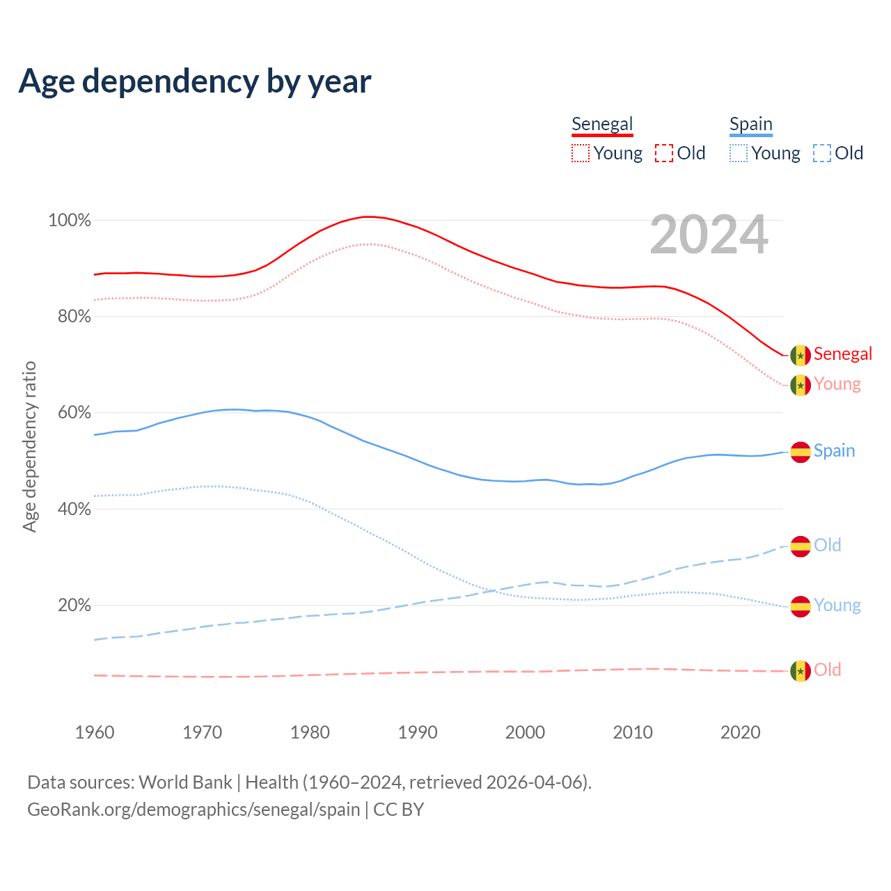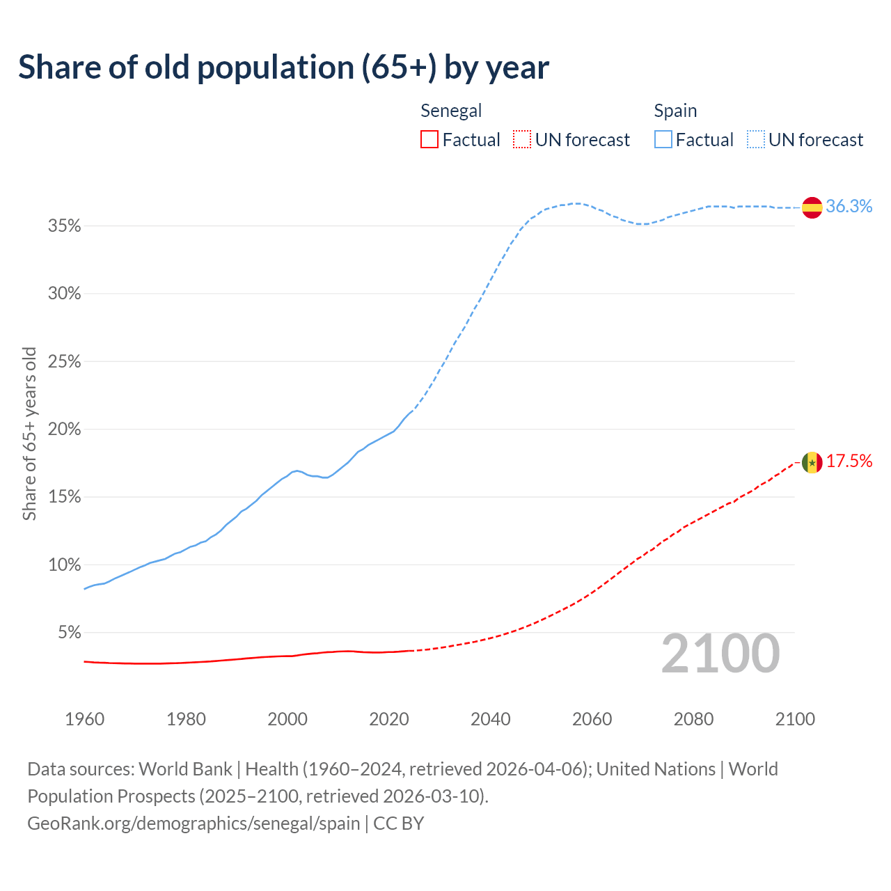The share of older people aged 65 and over is 3.62% in Senegal and 21.1% in Spain. Life expectancy in Senegal compared to Spain .