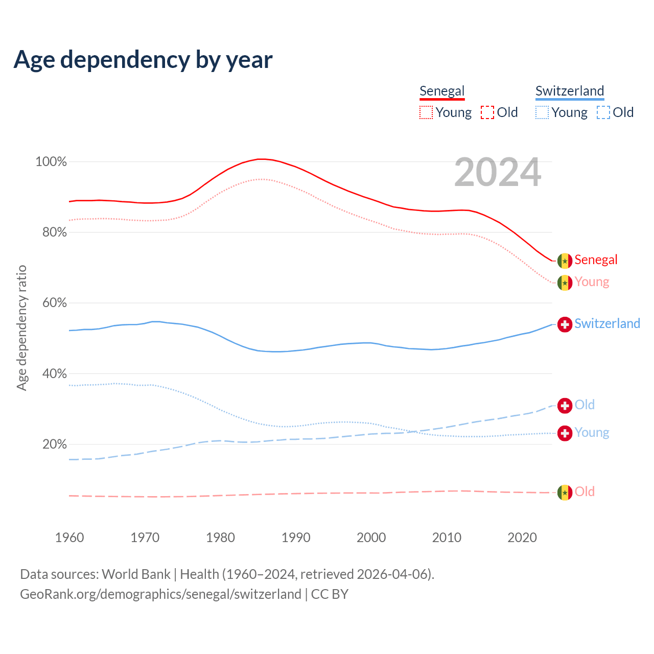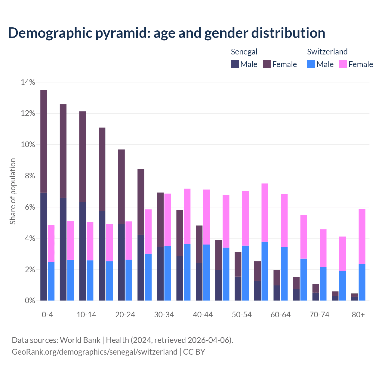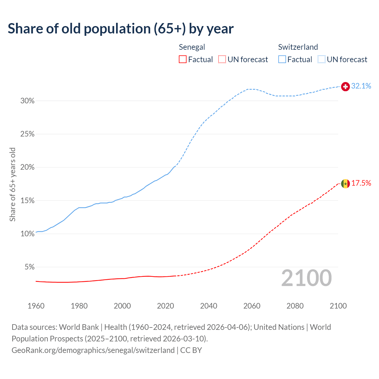 The share of older people aged 65 and over is 3.62% in Senegal and 20% in Switzerland. Life expectancy in Senegal compared to Switzerland .