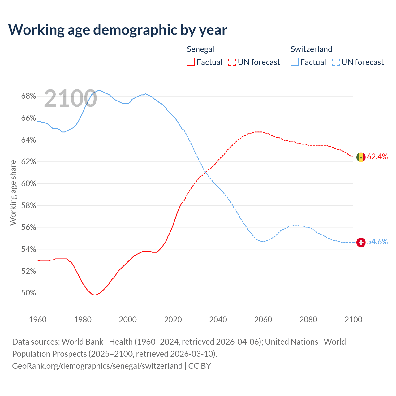 - Senegal has 11.3M working age adults (aged 15-64) vs 5.92M in Switzerland.