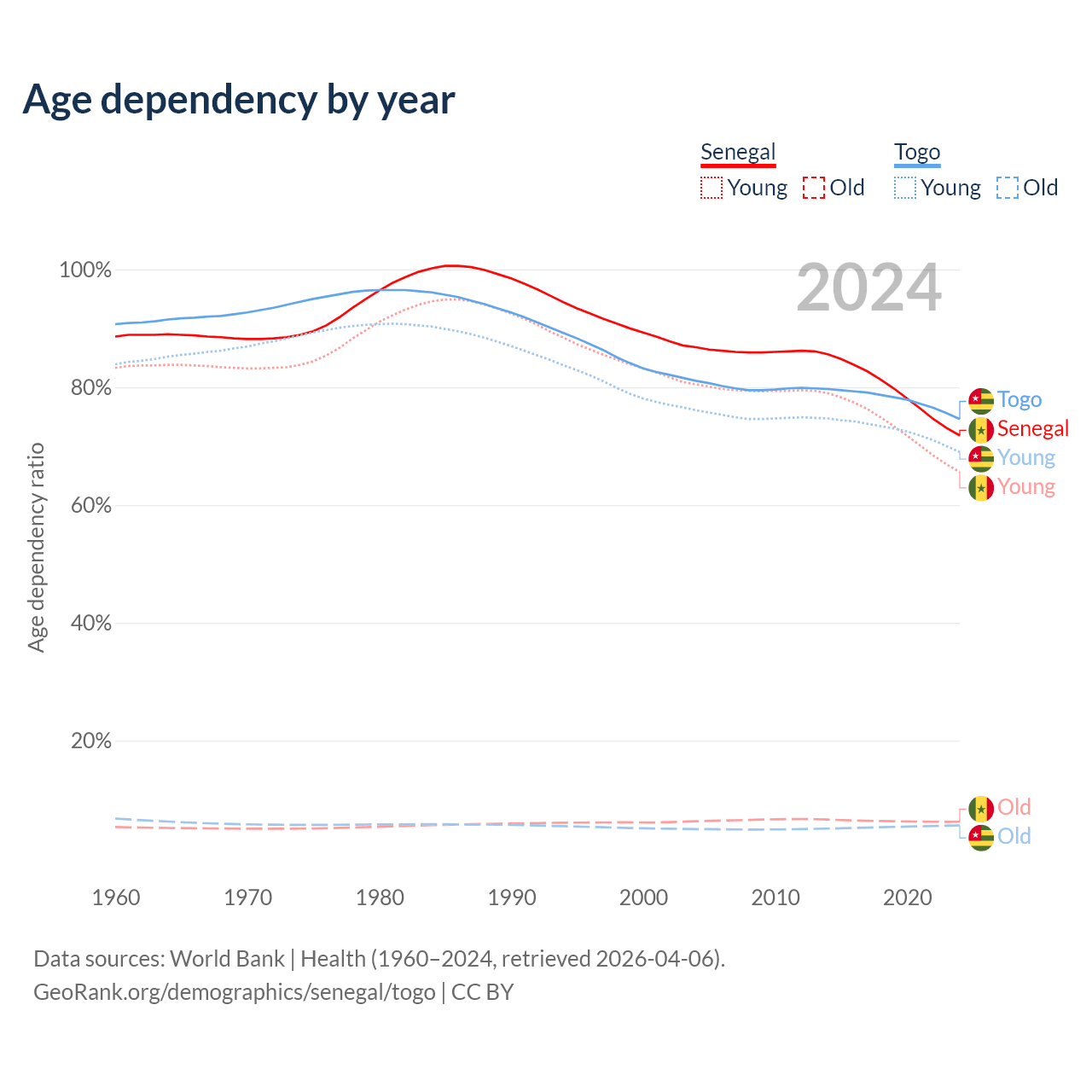 - The share of old-age demographic (65+) in Senegal is 3.62% vs 3.21% in Togo.