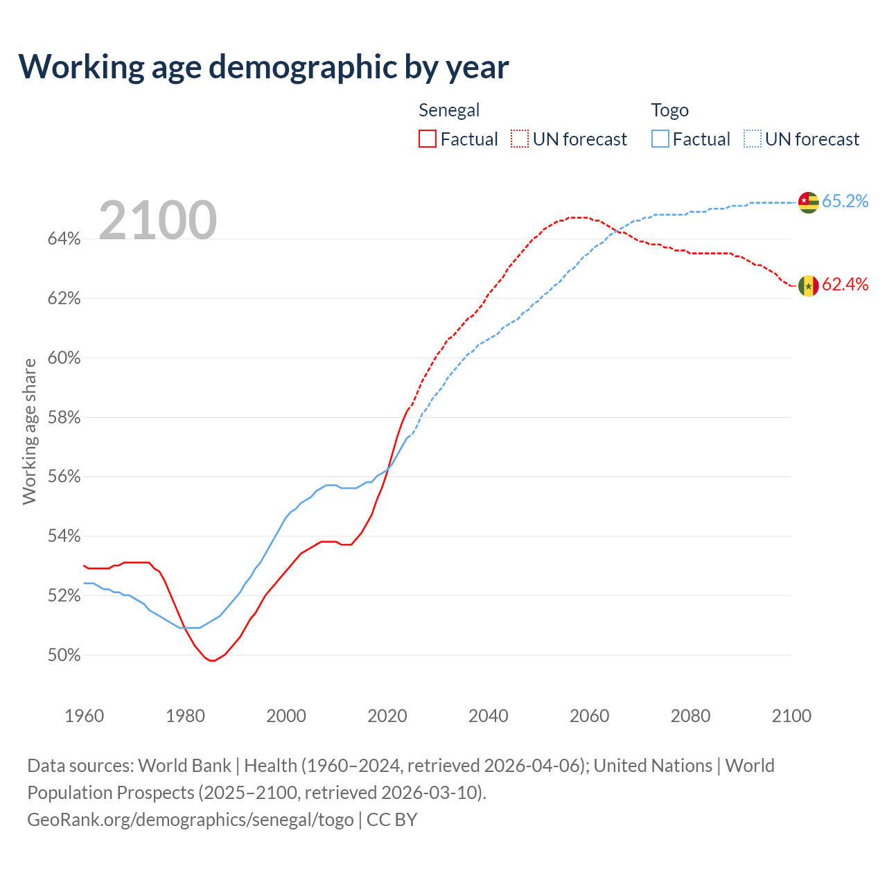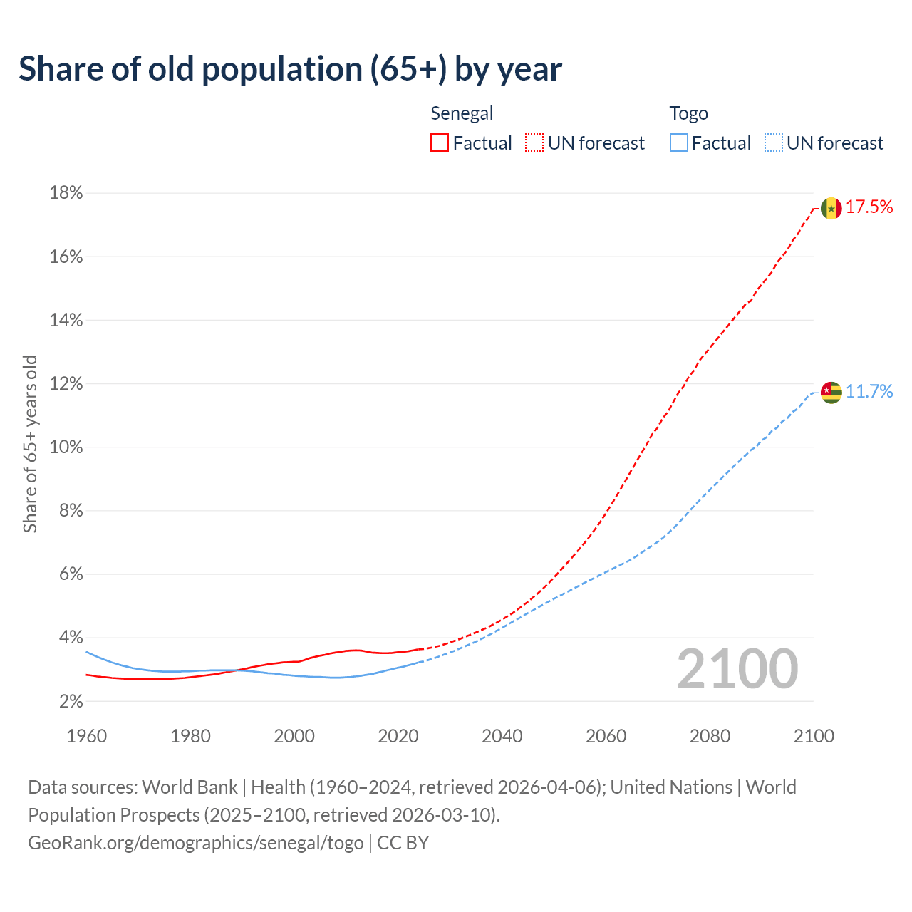 The share of older people aged 65 and over is 3.62% in Senegal and 3.21% in Togo. Life expectancy in Senegal compared to Togo .