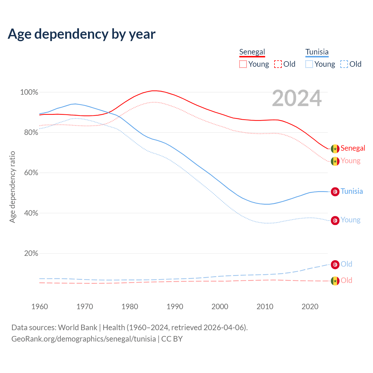 - Senegal is ranked 162/196 by median age (oldest to youngest) vs 86/196 for Tunisia.