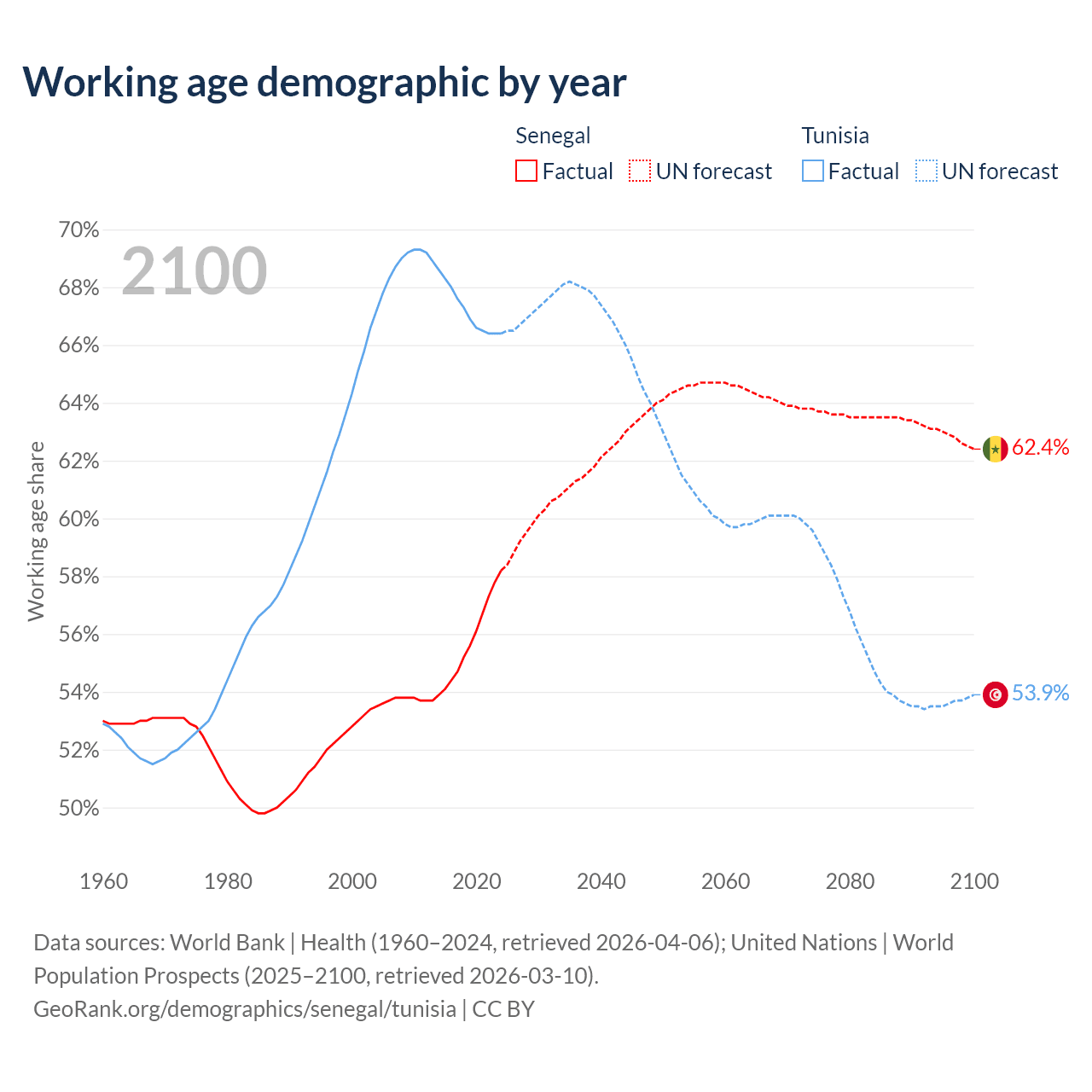 - Senegal has 11.3M working age adults (aged 15-64) vs 8.26M in Tunisia.