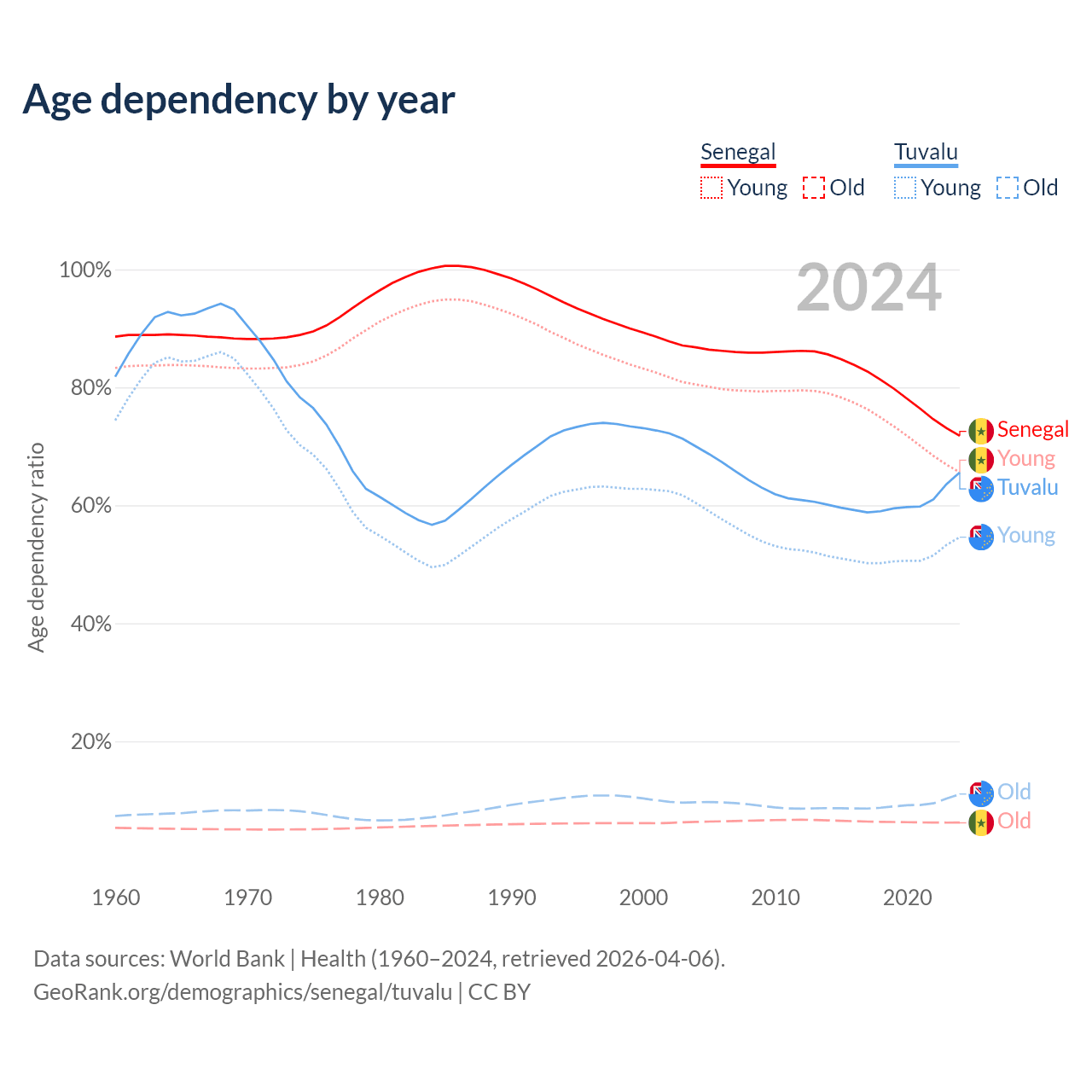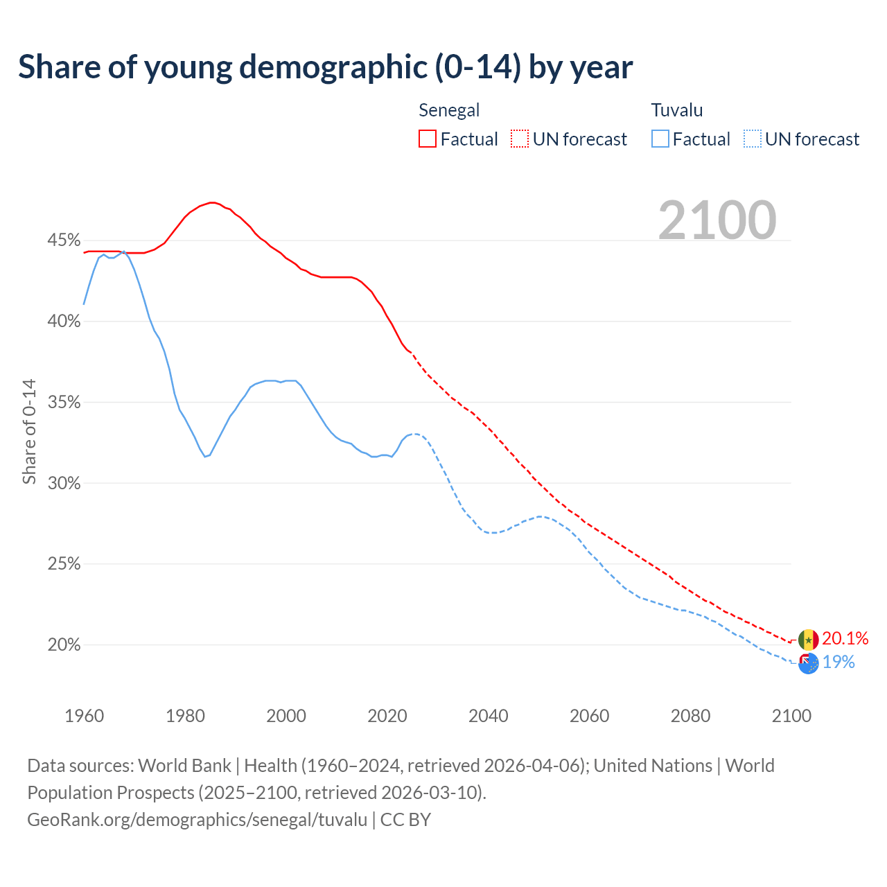- The share of young demographic (0-15 years old) in Senegal is 38.2% vs 32.9% in Tuvalu.