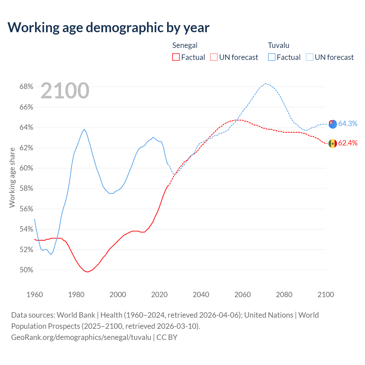 - Senegal has 11.3M working age adults (aged 15-64) vs 5.64K in Tuvalu.