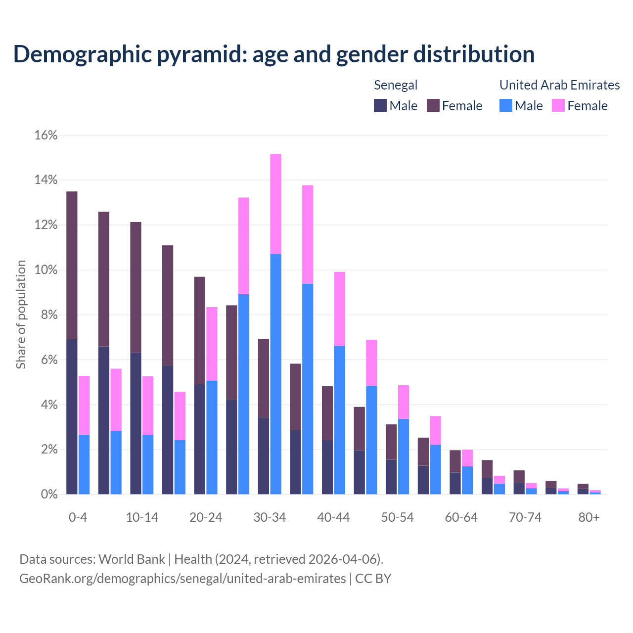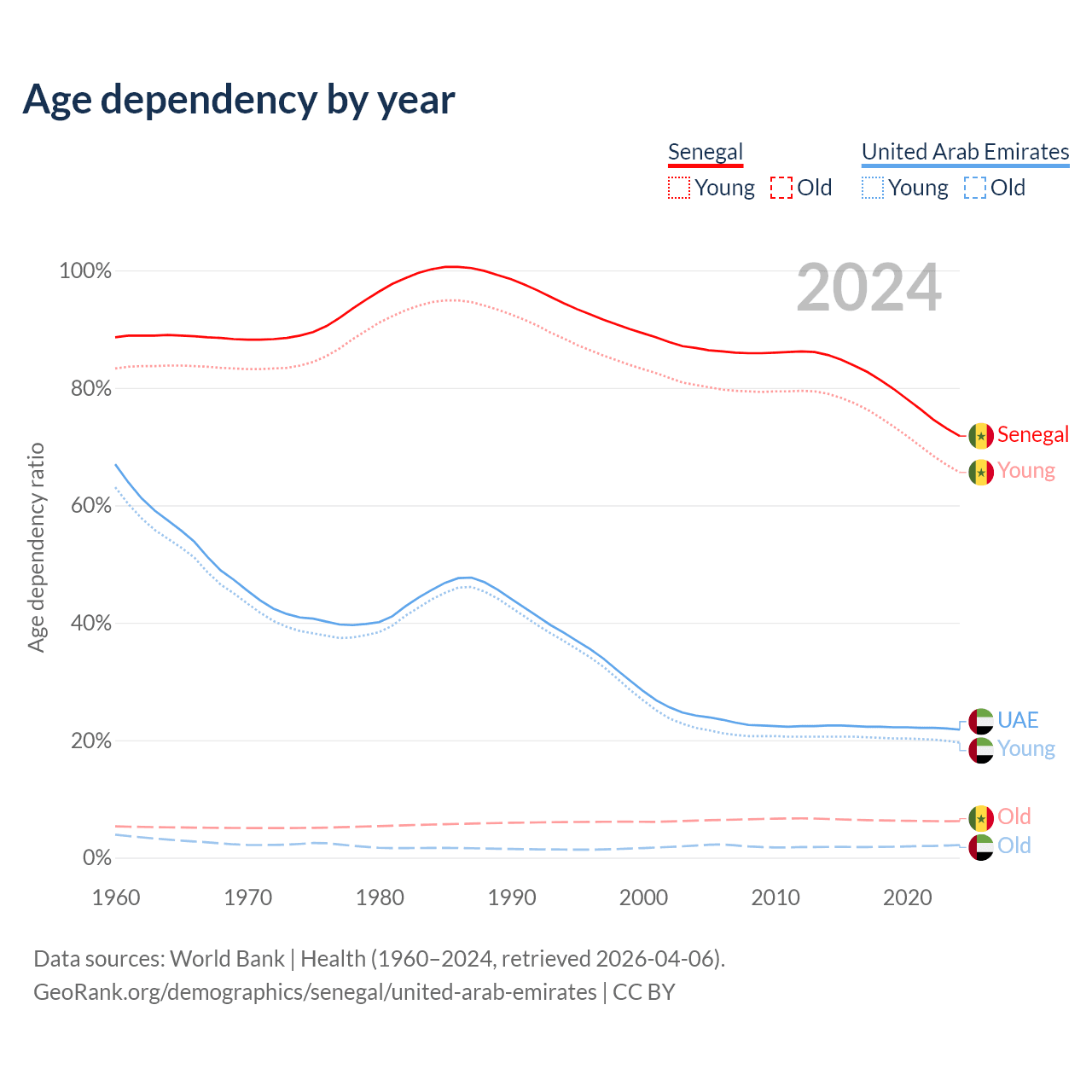 - Senegal is ranked 162/196 by median age (oldest to youngest) vs 91/196 for the United Arab Emirates.