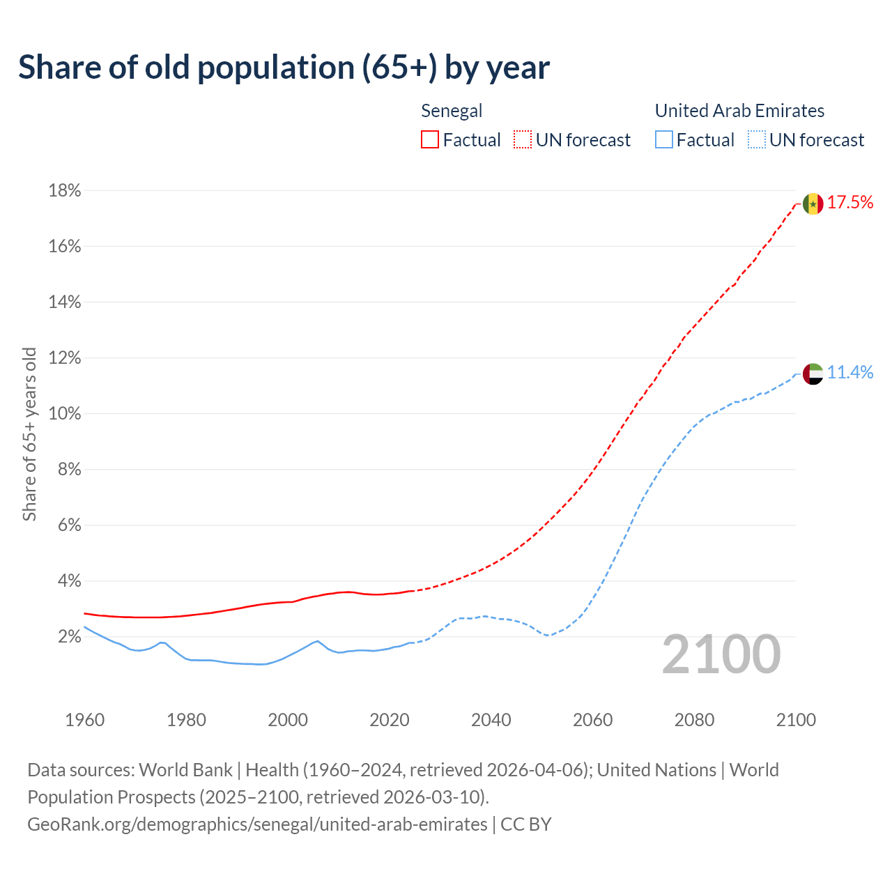 The share of older people aged 65 and over is 3.62% in Senegal and 1.77% in the United Arab Emirates. Life expectancy in Senegal compared to the United Arab Emirates .