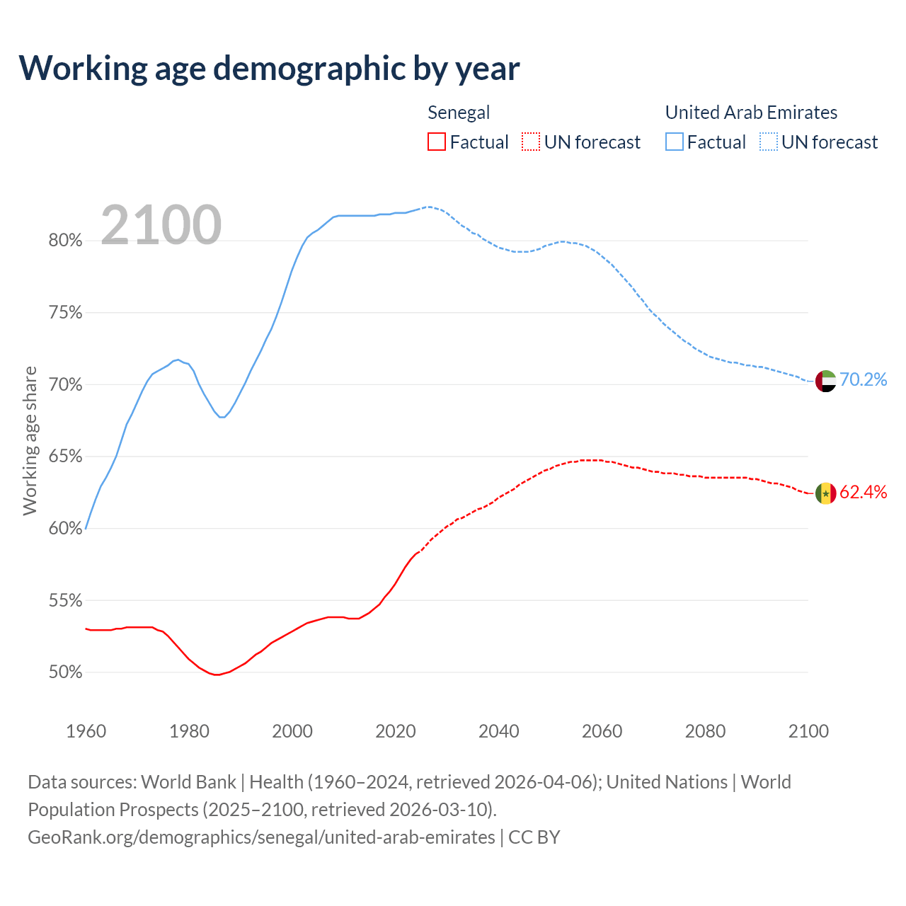 - Senegal has 11.3M working age adults (aged 15-64) vs 9.6M in the United Arab Emirates.
