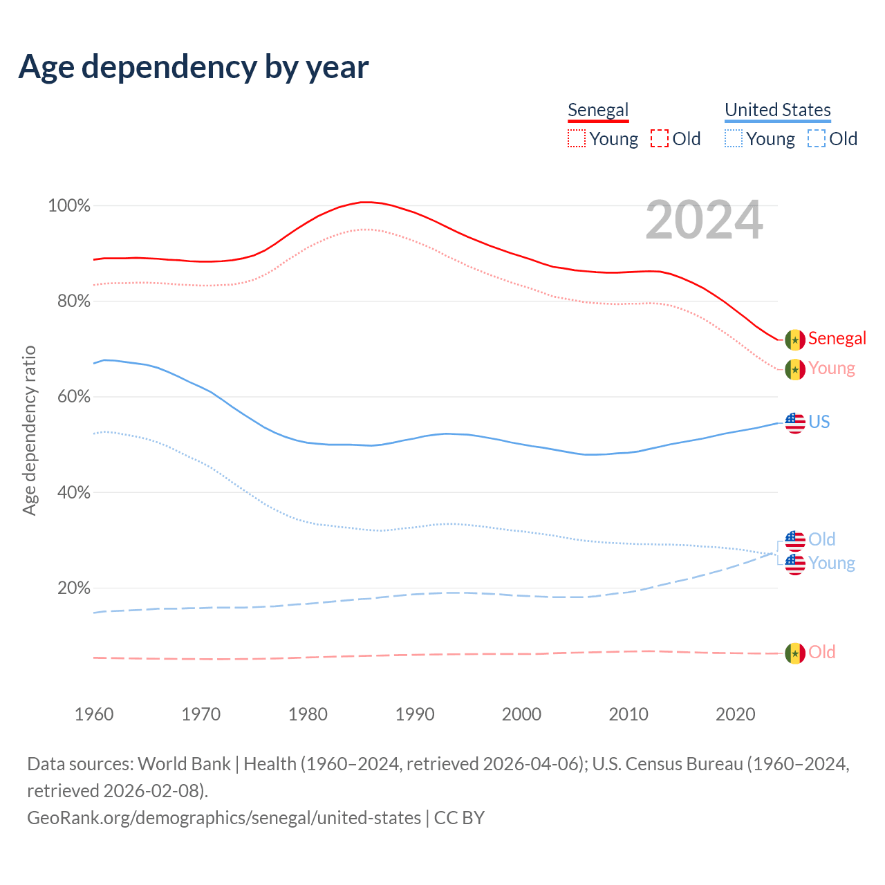 - The share of old-age demographic (65+) in Senegal is 3.62% vs 17.9% in the United States.