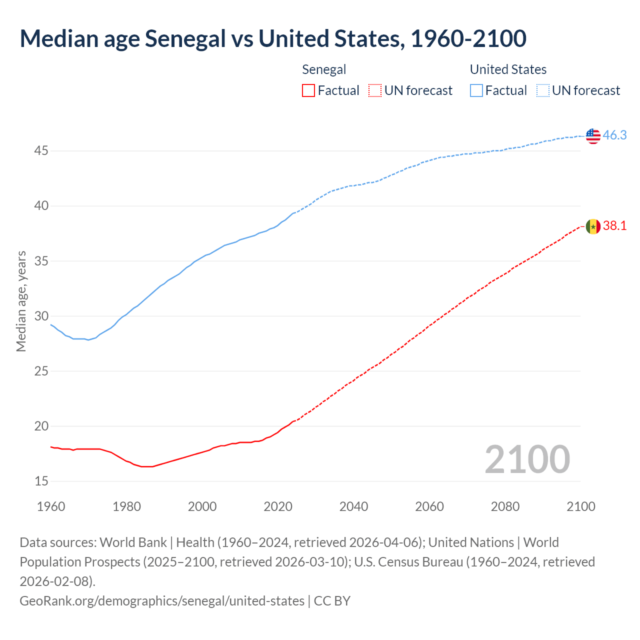 - Senegal is ranked 162/196 by median age (oldest to youngest) vs 50/196 for the United States.