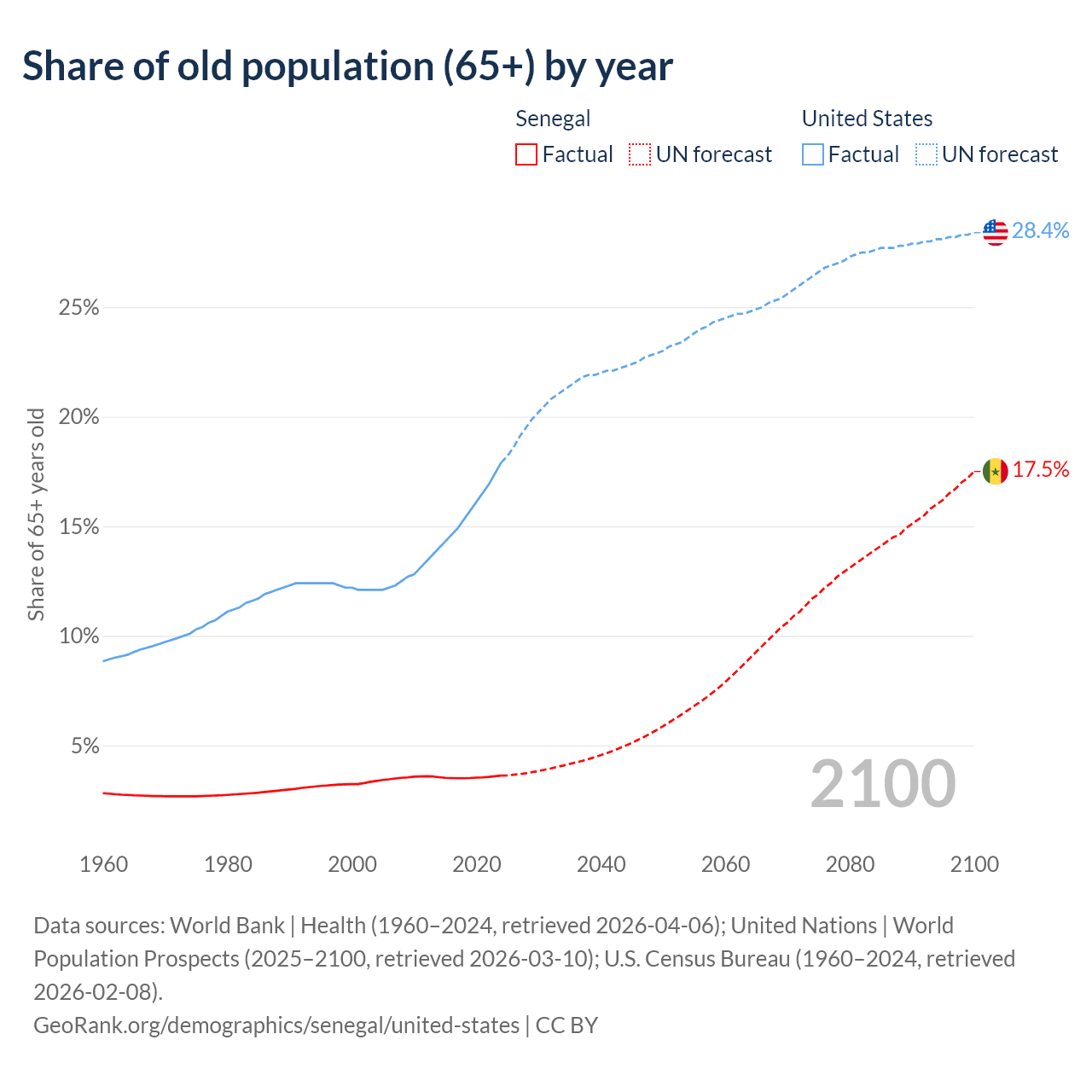 The share of older people aged 65 and over is 3.62% in Senegal and 17.9% in the United States. Life expectancy in Senegal compared to the United States .