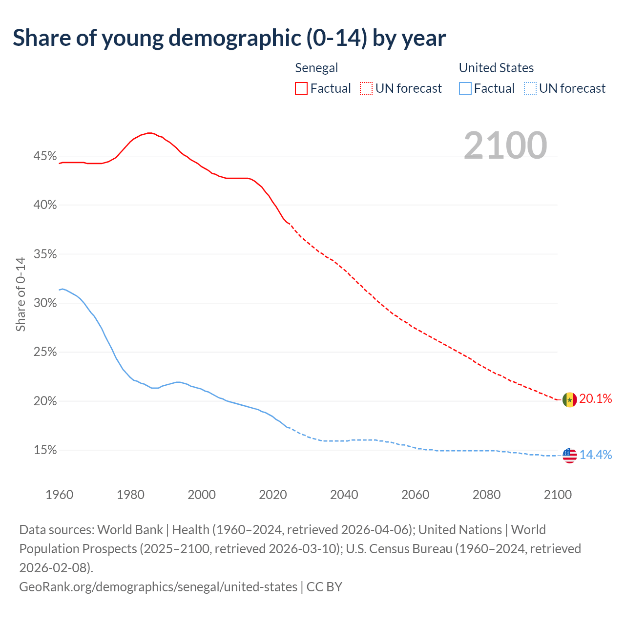 - The share of young demographic (0-15 years old) in Senegal is 38.2% vs 17.3% in the United States.