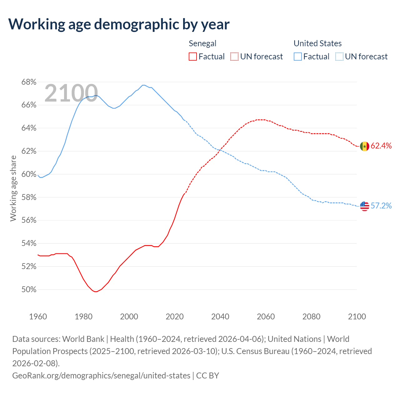 - Senegal has 11.3M working age adults (aged 15-64) vs 223M in the United States.
