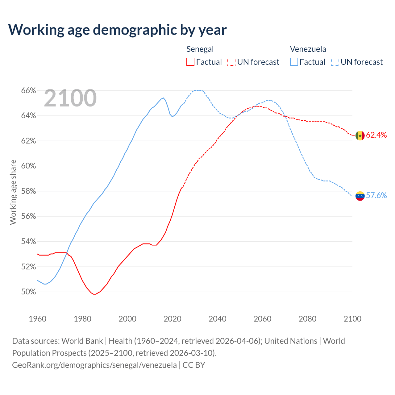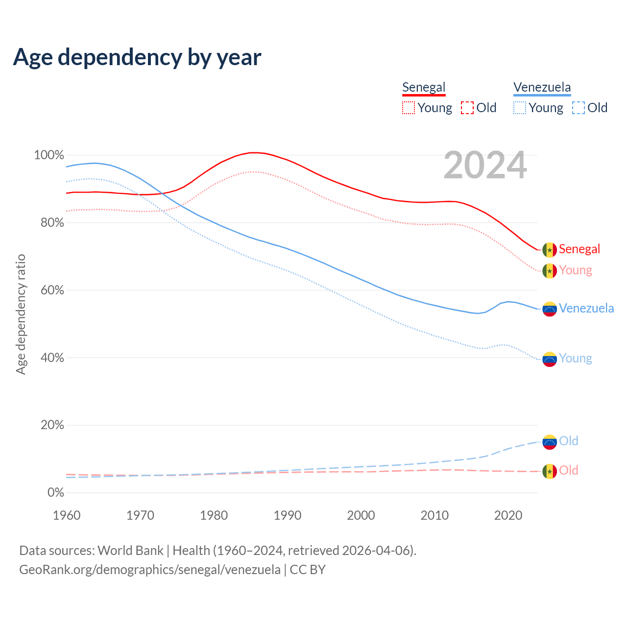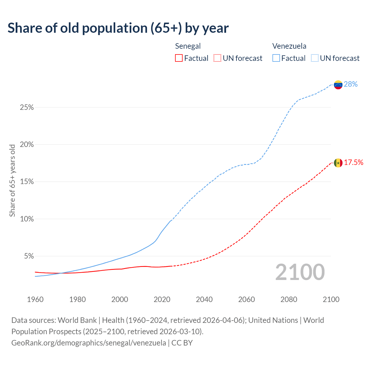 The share of older people aged 65 and over is 3.62% in Senegal and 9.68% in Venezuela. Life expectancy in Senegal compared to Venezuela .