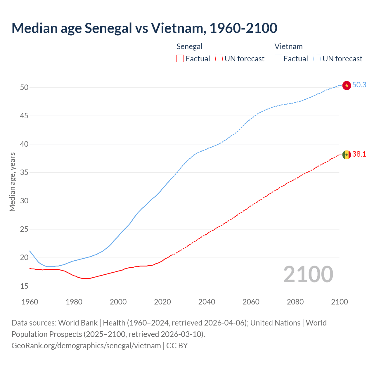 Median age Senegal vs Vietnam, 1960-2100