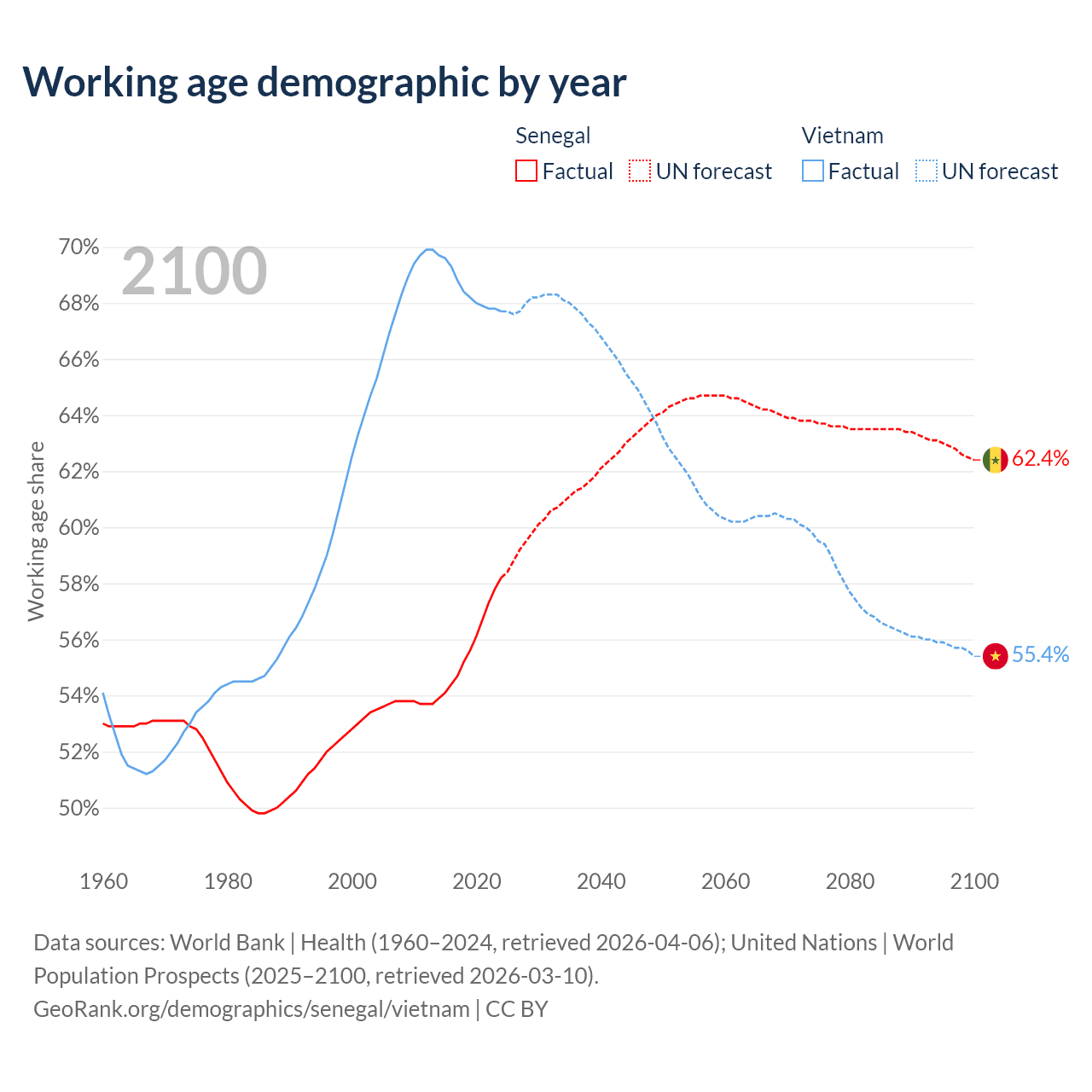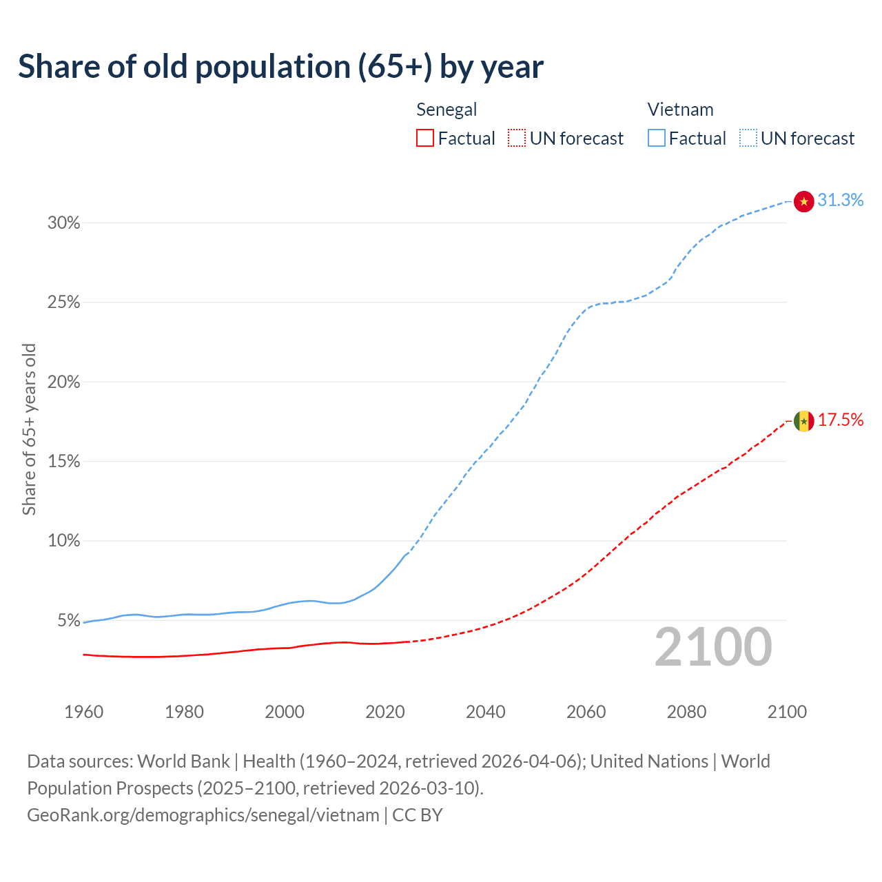 The share of older people aged 65 and over is 3.62% in Senegal and 9.05% in Vietnam. Life expectancy in Senegal compared to Vietnam .