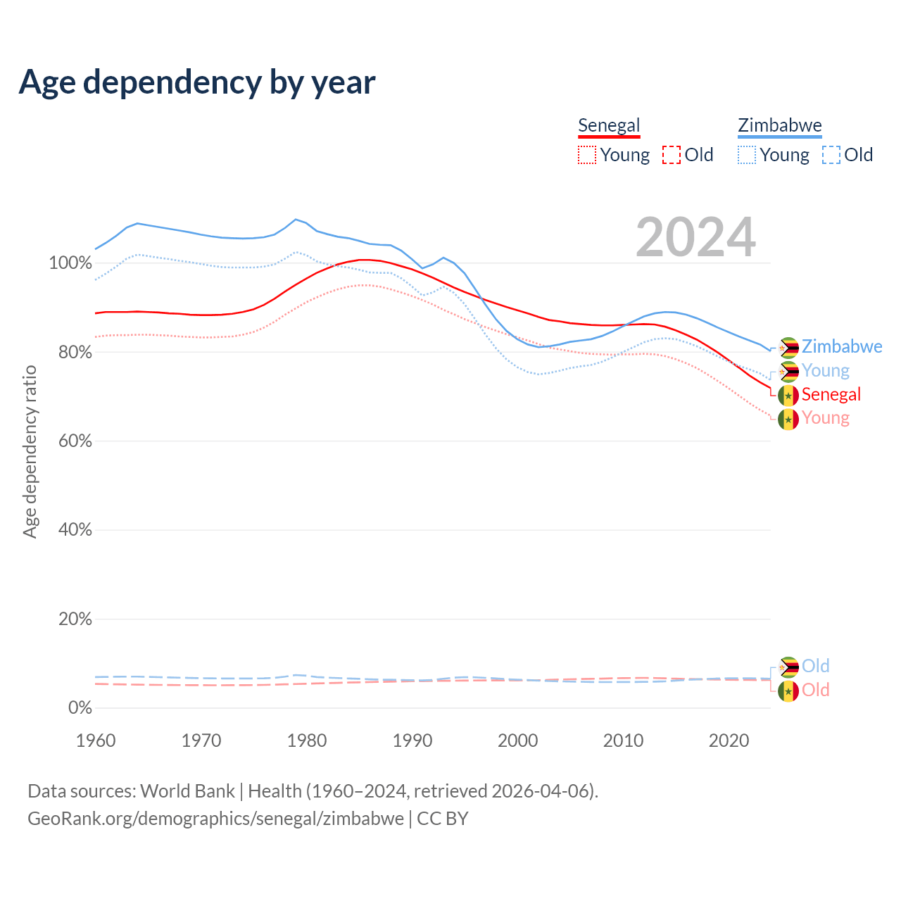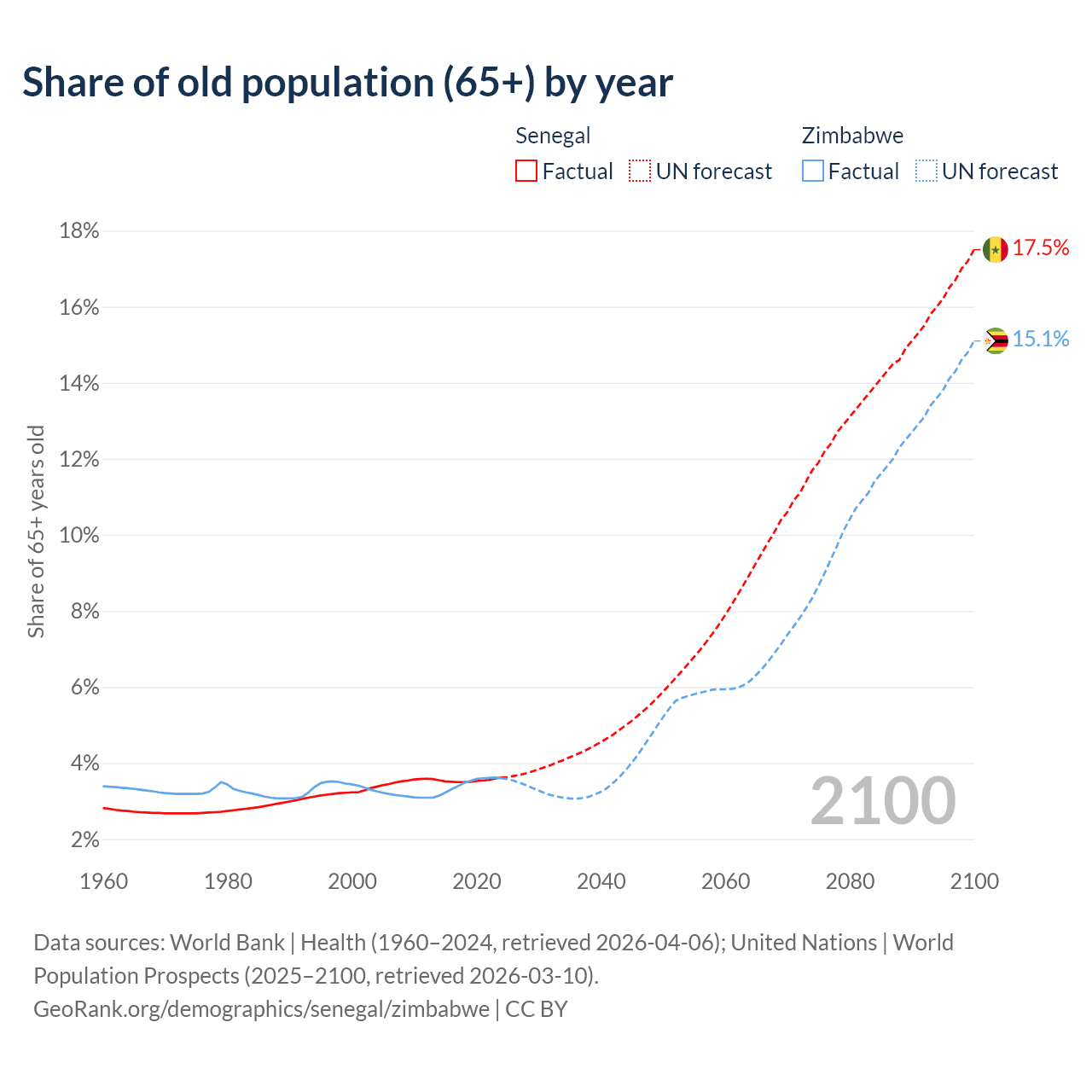 The share of older people aged 65 and over is 3.62% in Senegal and 3.6% in Zimbabwe. Life expectancy in Senegal compared to Zimbabwe .