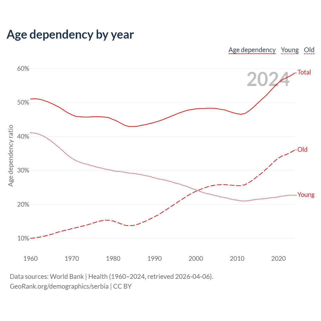 The share of older people aged 65 and over in Serbia increased from 17.2% to 22.7% between 2004 and 2024.