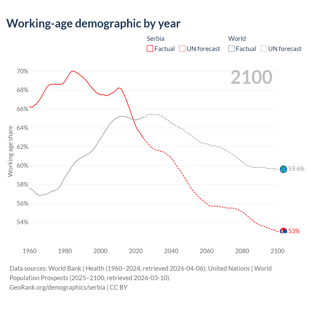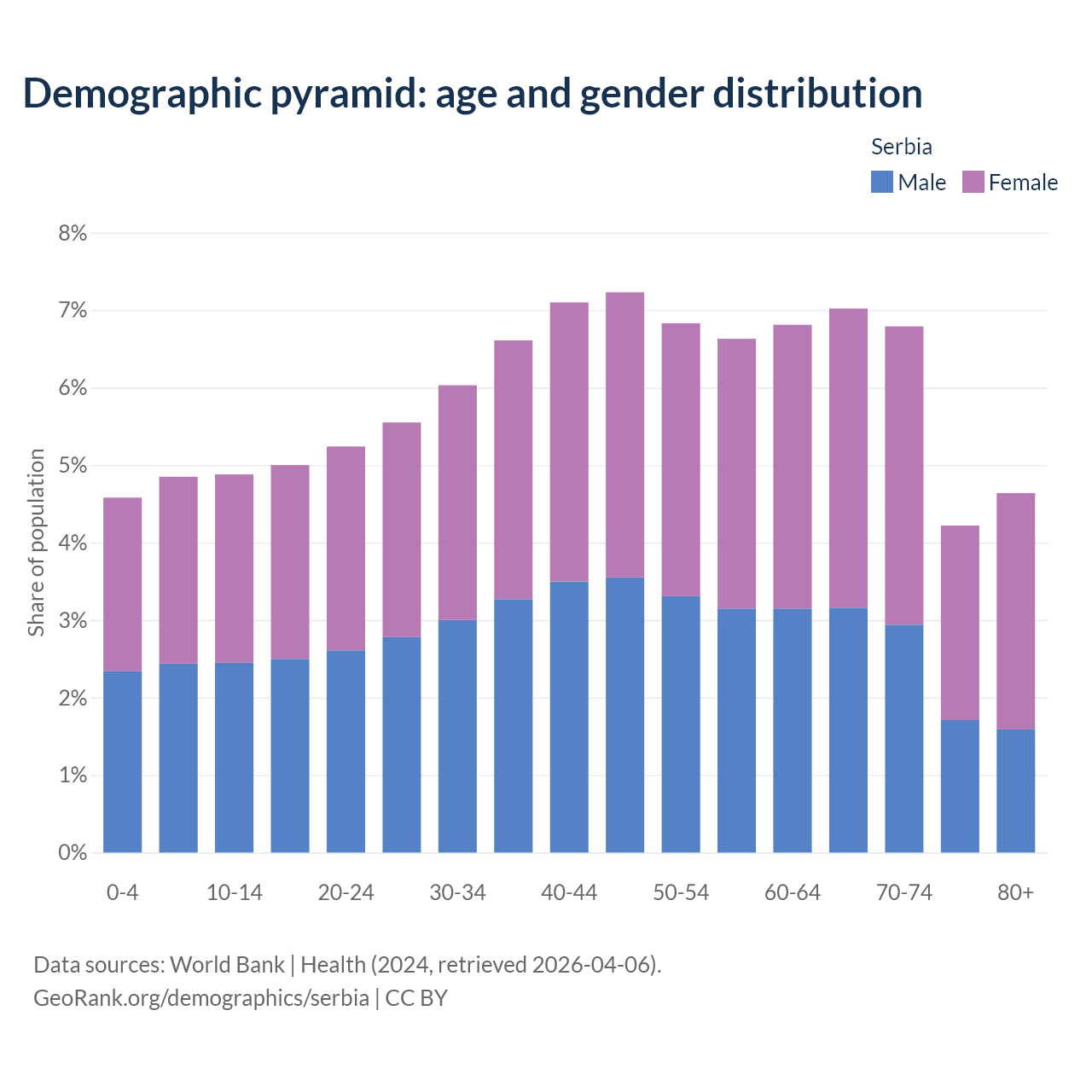 With a population of 6.59M people, Serbia has a median age of 45.1 years which makes it the 15/196 oldest country. 14.3% of the demographic are children 0-14 years old, 63% are working-age people aged 15-64, and 22.7% are older population aged 65+ years.