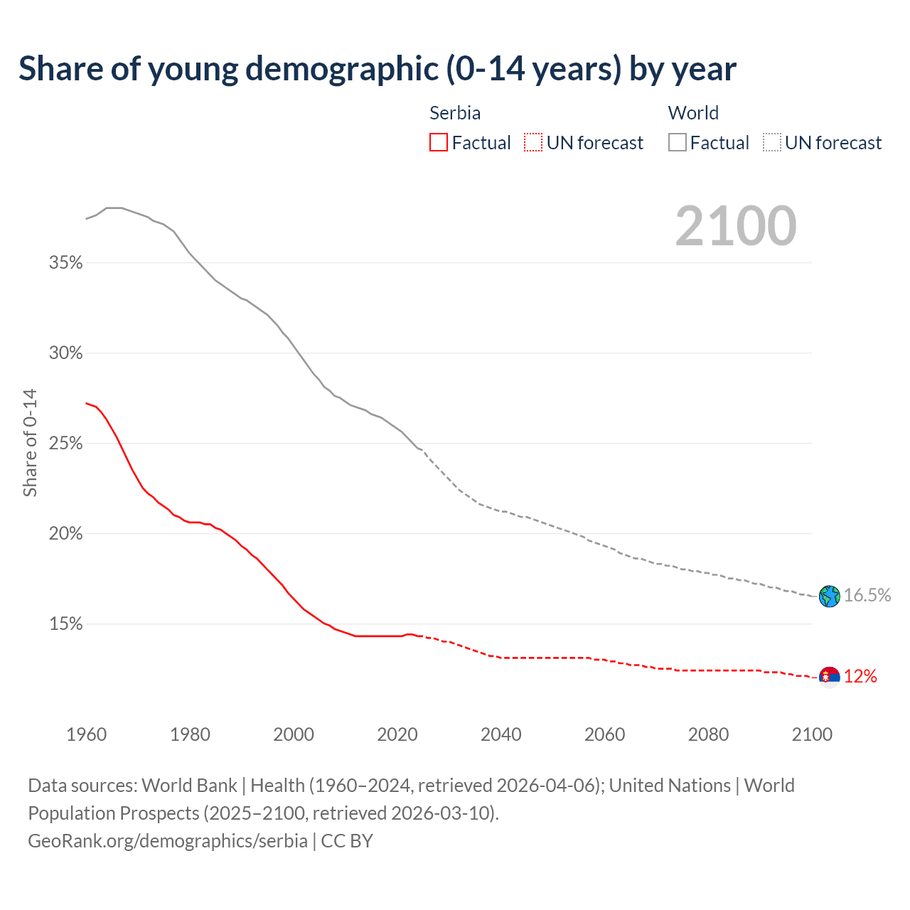 The share of children aged 0-14 in Serbia decreased from 15.4% to 14.3% between 2004 and 2024 due to changes in birth rates.