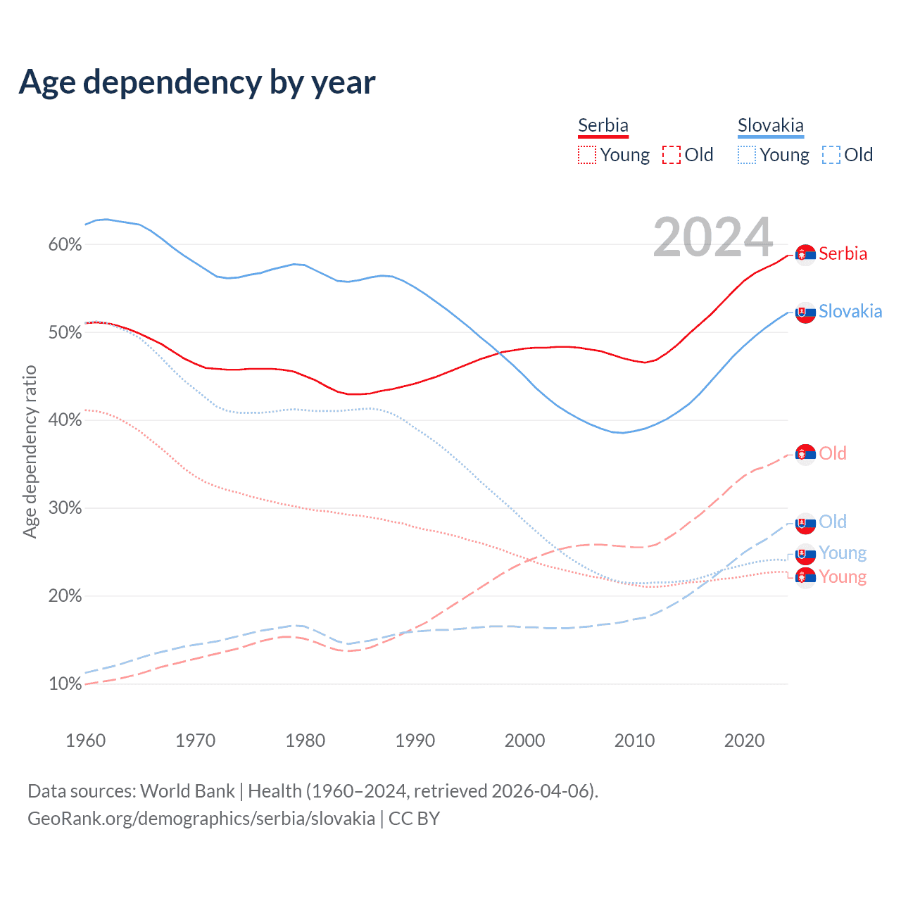 The share of older people aged 65 and over is 22.7% in Serbia and 18.5% in Slovakia. Life expectancy in Serbia compared to Slovakia .