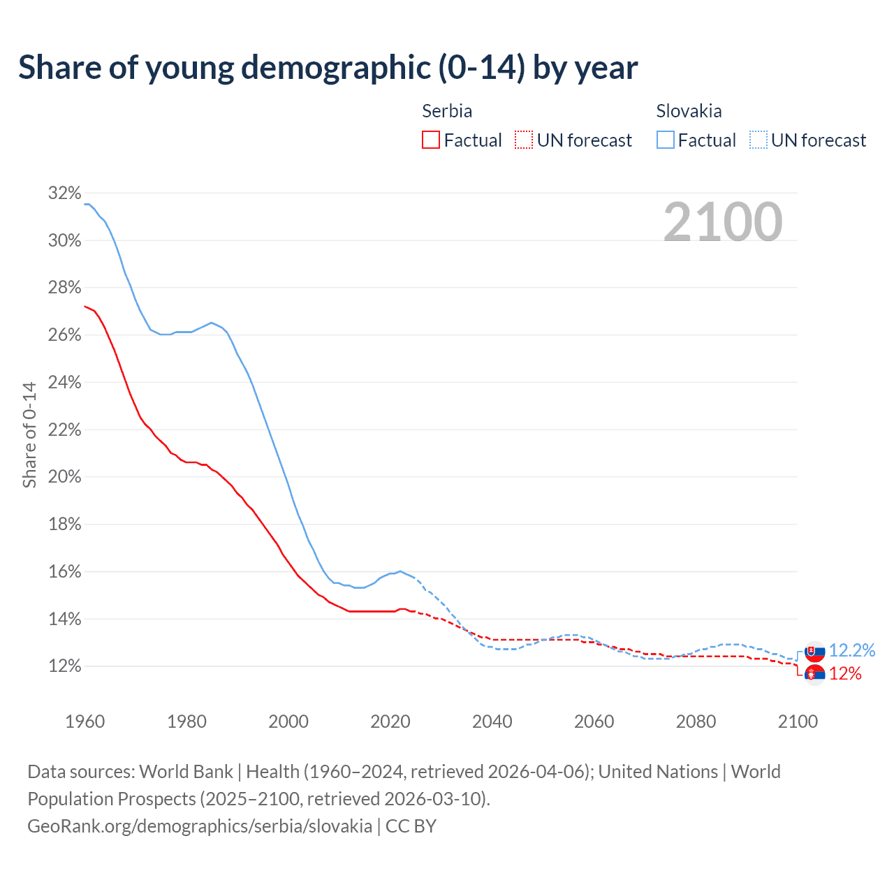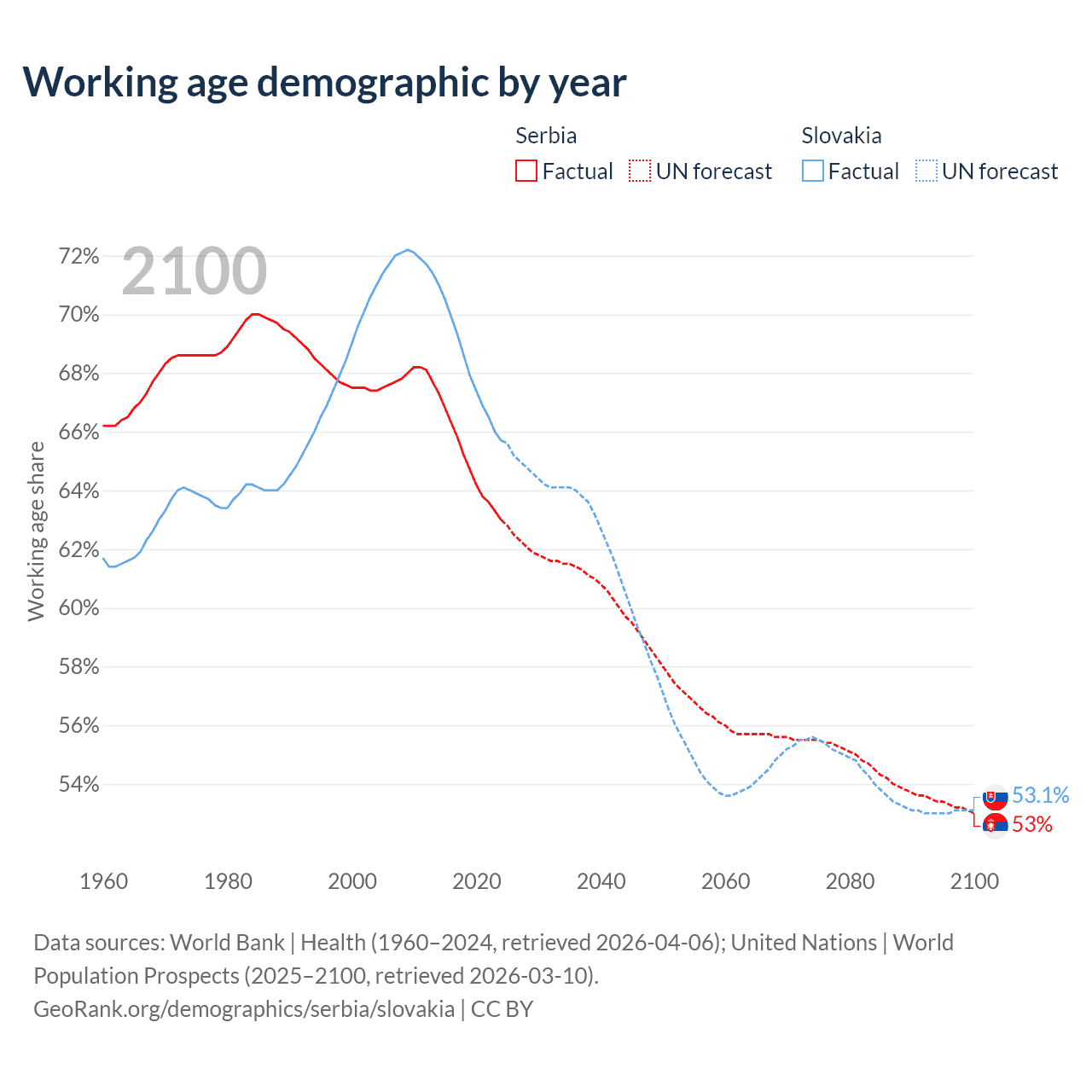 Median age Serbia vs Slovakia, 1960-2100