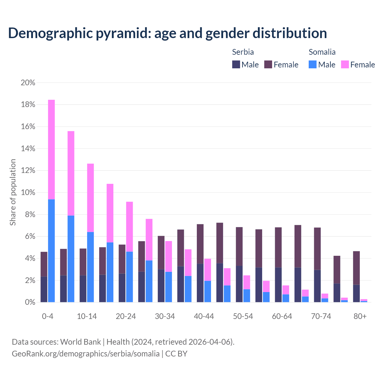 - As of 2026, the population of Serbia is 6.49M vs 20.5M in Somalia - 3.16 times difference.