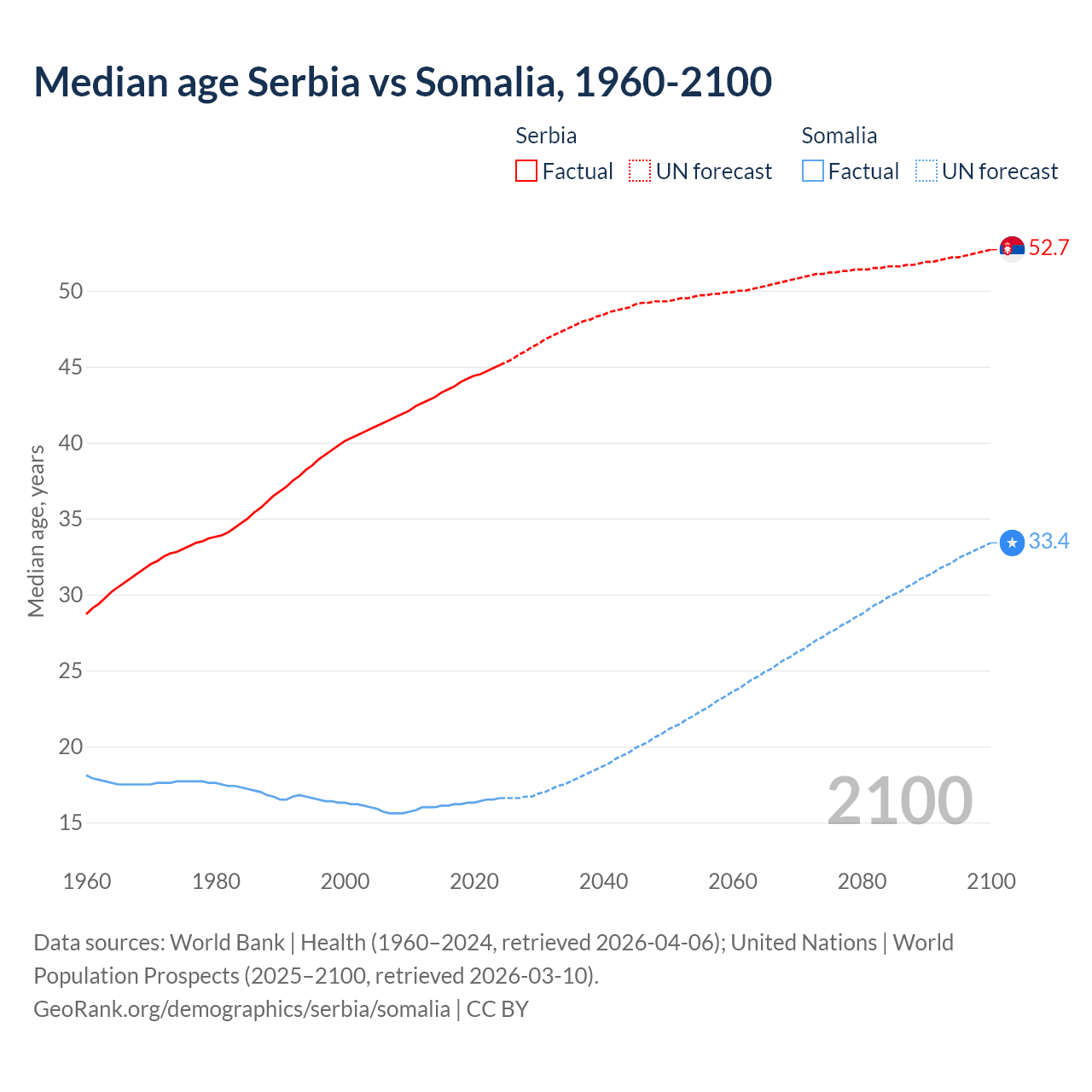 - Serbia is ranked 15/196 by median age (oldest to youngest) vs 194/196 for Somalia.