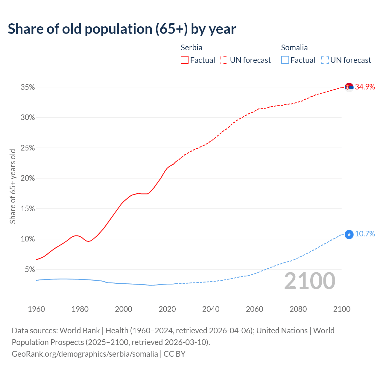 - The share of old-age demographic (65+) in Serbia is 22.7% vs 2.59% in Somalia.