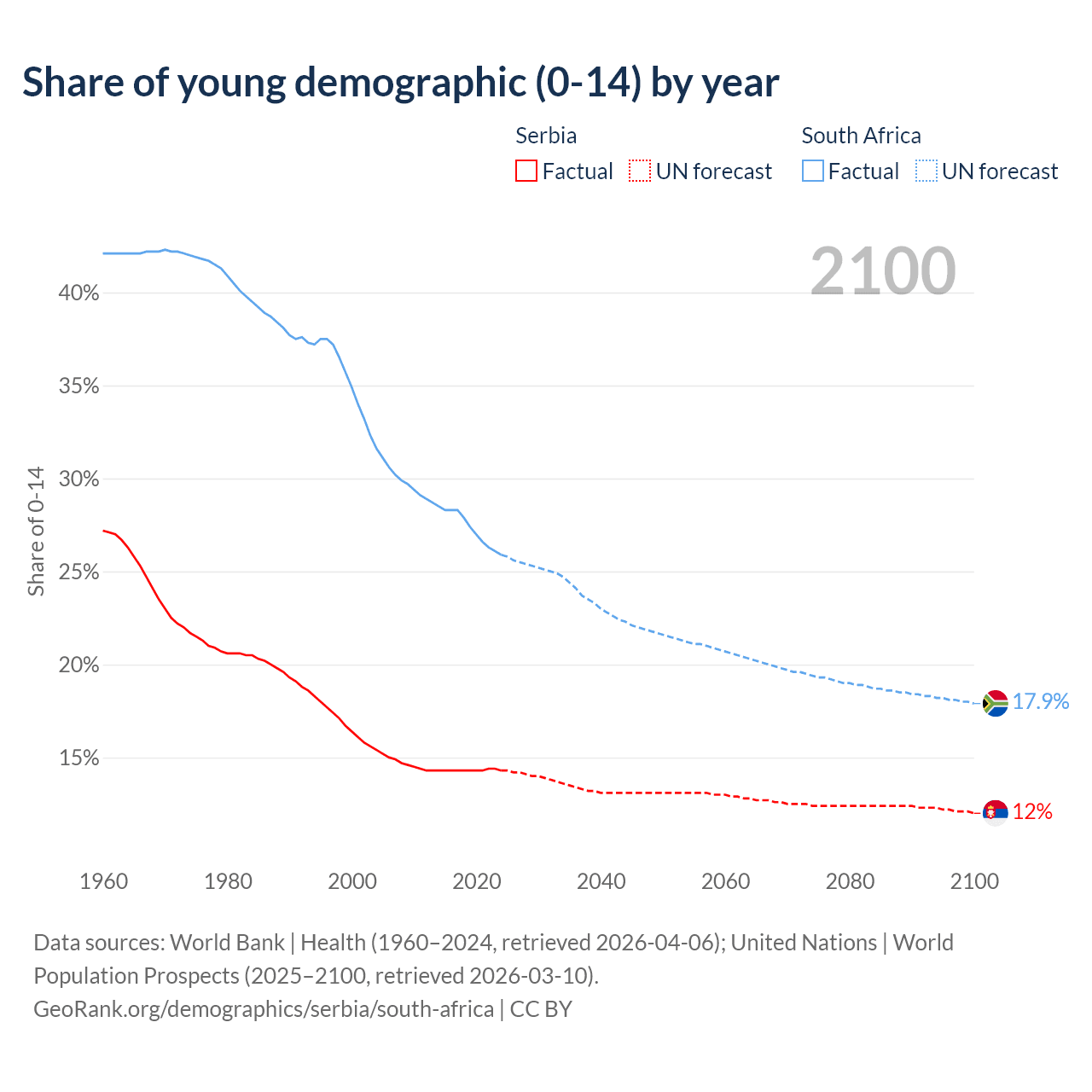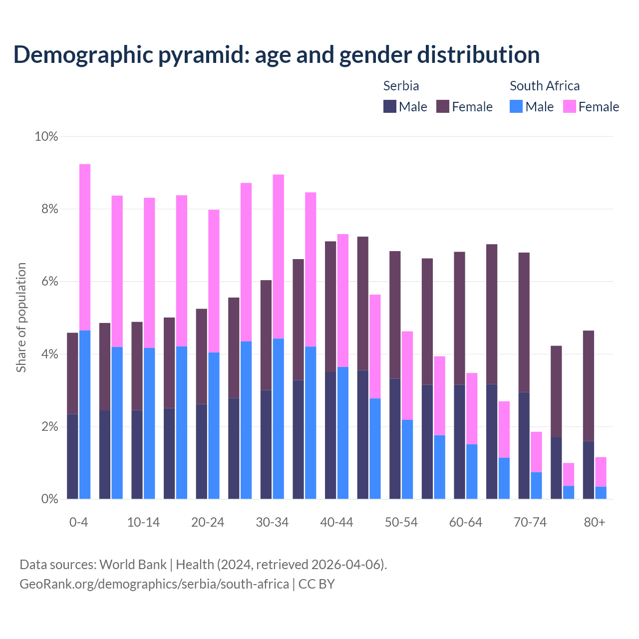 - Serbia is ranked 15/196 by median age (oldest to youngest) vs 107/196 for South Africa.