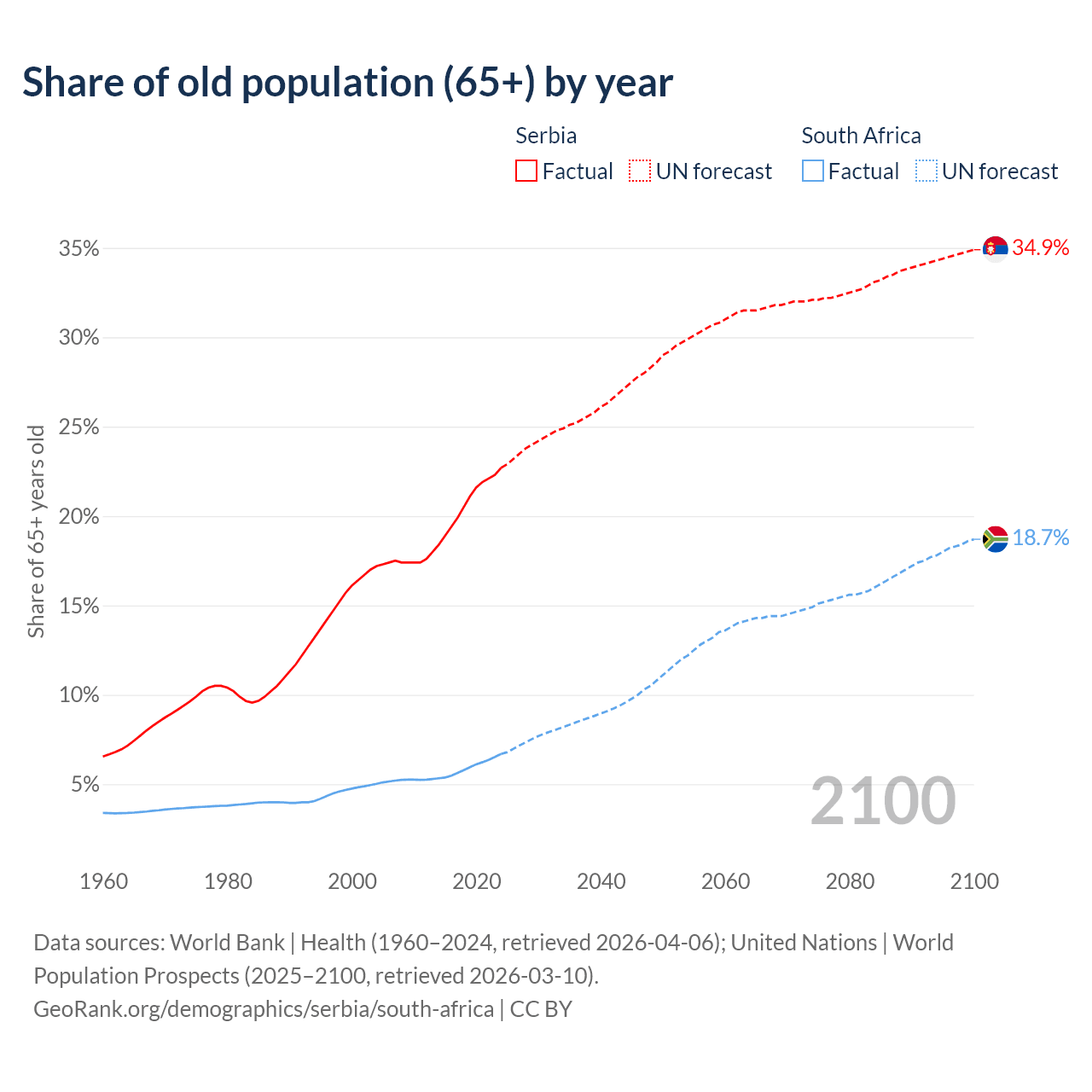 The share of older people aged 65 and over is 22.7% in Serbia and 6.69% in South Africa. Life expectancy in Serbia compared to South Africa .