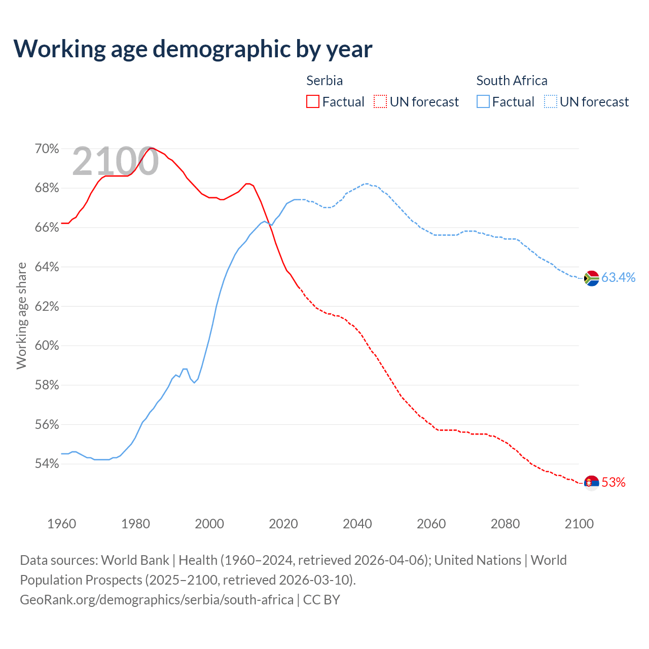 - Serbia has 4.09M working age adults (aged 15-64) vs 44.3M in South Africa.