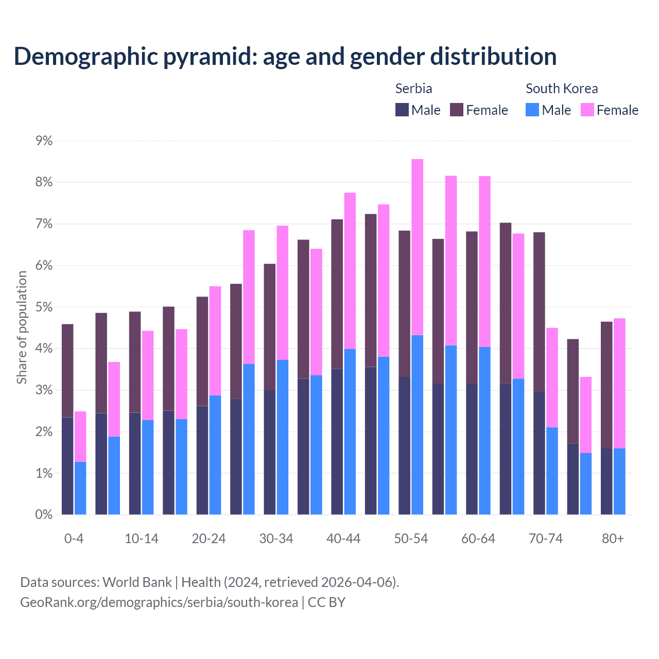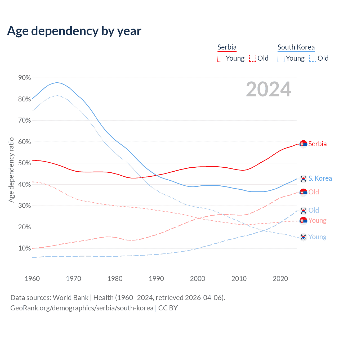 - Serbia is ranked 15/196 by median age (oldest to youngest) vs 10/196 for South Korea.