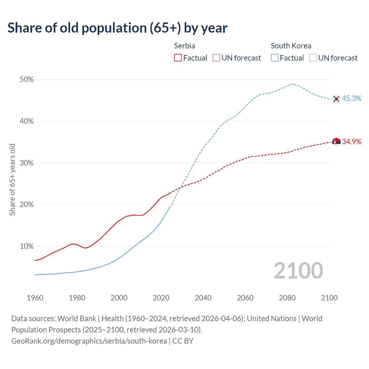 The share of older people aged 65 and over is 22.7% in Serbia and 19.3% in South Korea. Life expectancy in Serbia compared to South Korea .