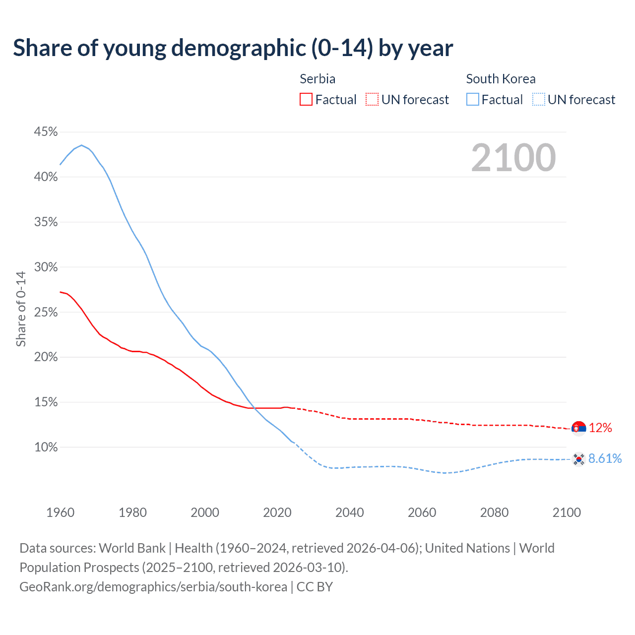 - The share of young demographic (0-15 years old) in Serbia is 14.3% vs 10.6% in South Korea.