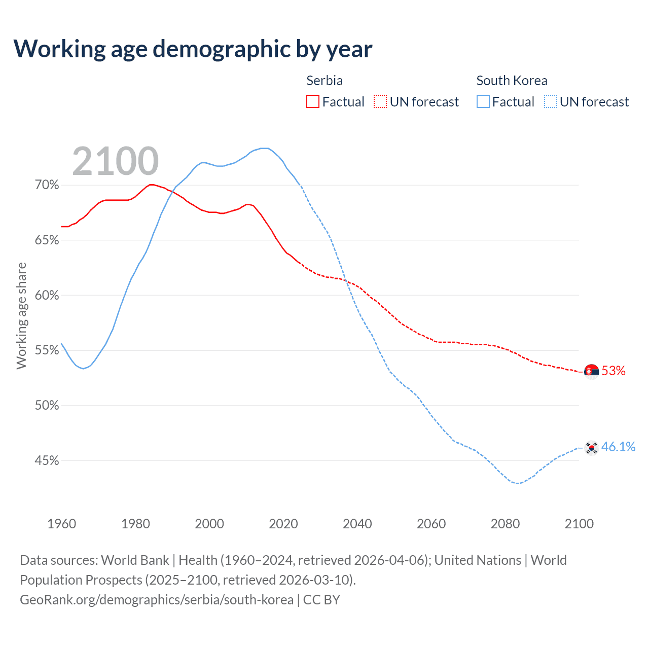 - Serbia has 4.09M working age adults (aged 15-64) vs 36.2M in South Korea.