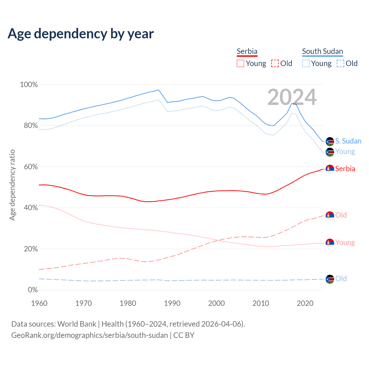 Data sources: World Bank | Health (1960–2024, retrieved 2026-04-06); U.S. Census Bureau (1960–2024, retrieved 2026-02-08).