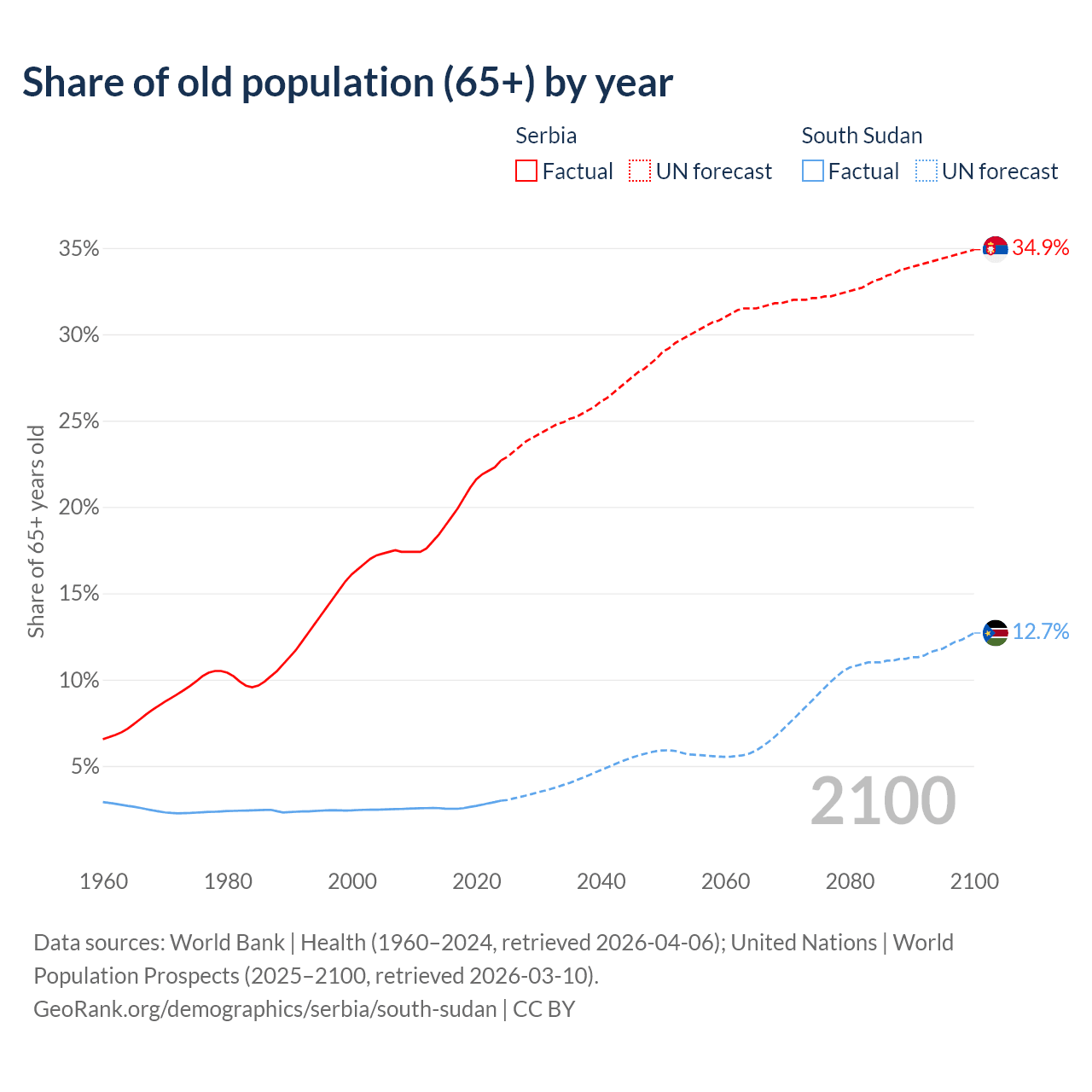 The share of older people aged 65 and over is 22.7% in Serbia and 2.99% in South Sudan. Life expectancy in Serbia compared to South Sudan .