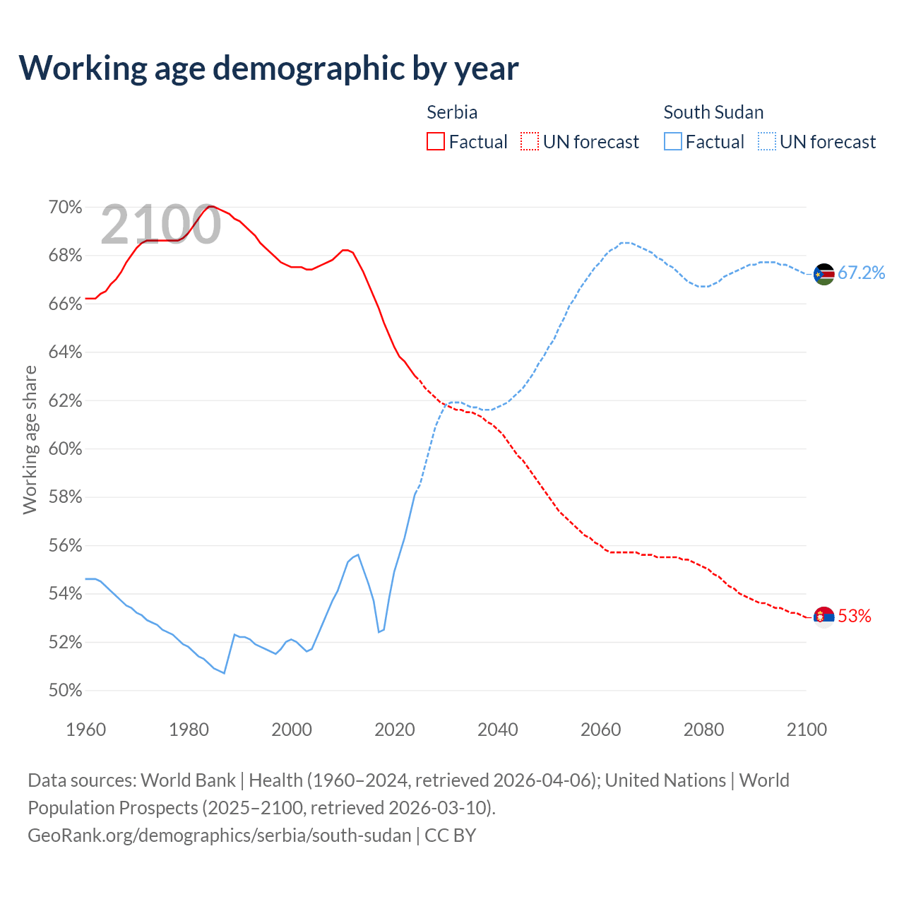 Median age Serbia vs South Sudan, 1960-2100
