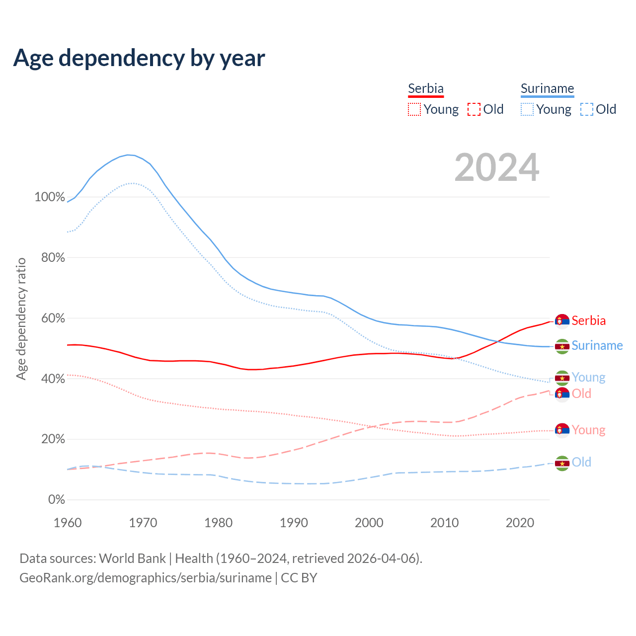 - Serbia is ranked 15/196 by median age (oldest to youngest) vs 109/196 for Suriname.